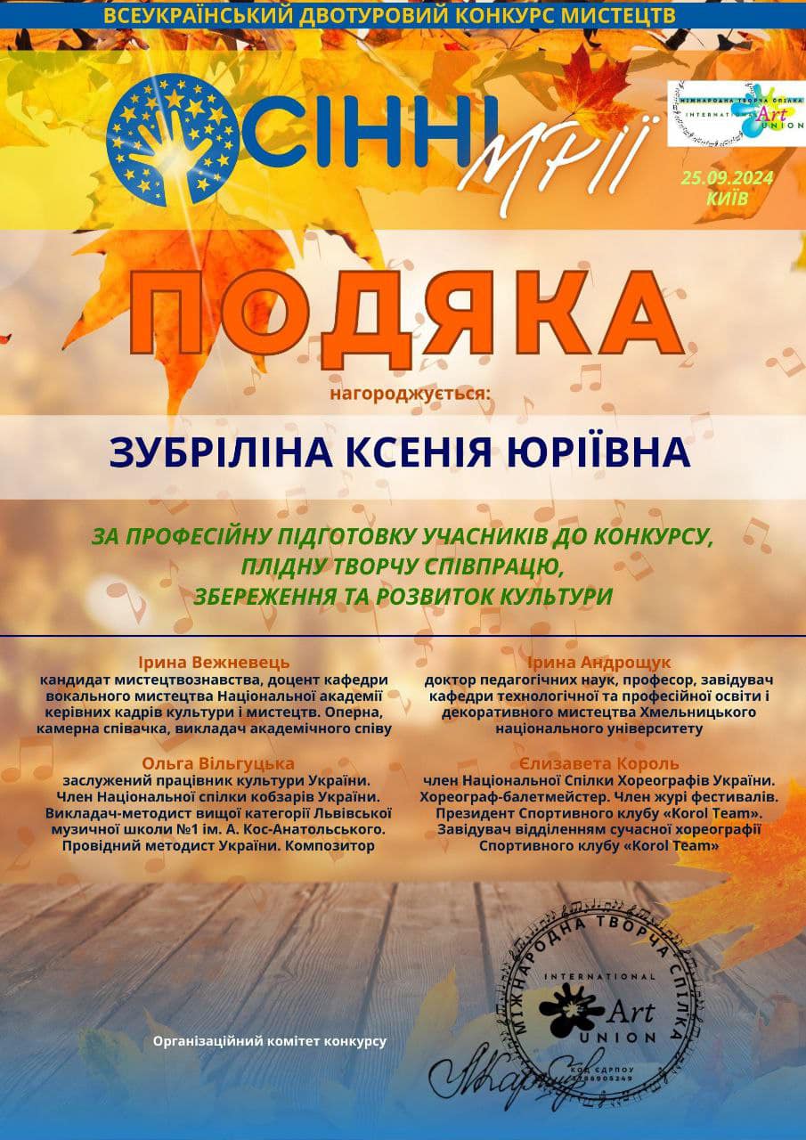 Викладач Ксенія Зубріліна отримала подяку від організаторів конкурсу за професійну підготовку учасників до конкурсу, плідну творчу співпрацю, збереження та розвиток культури.