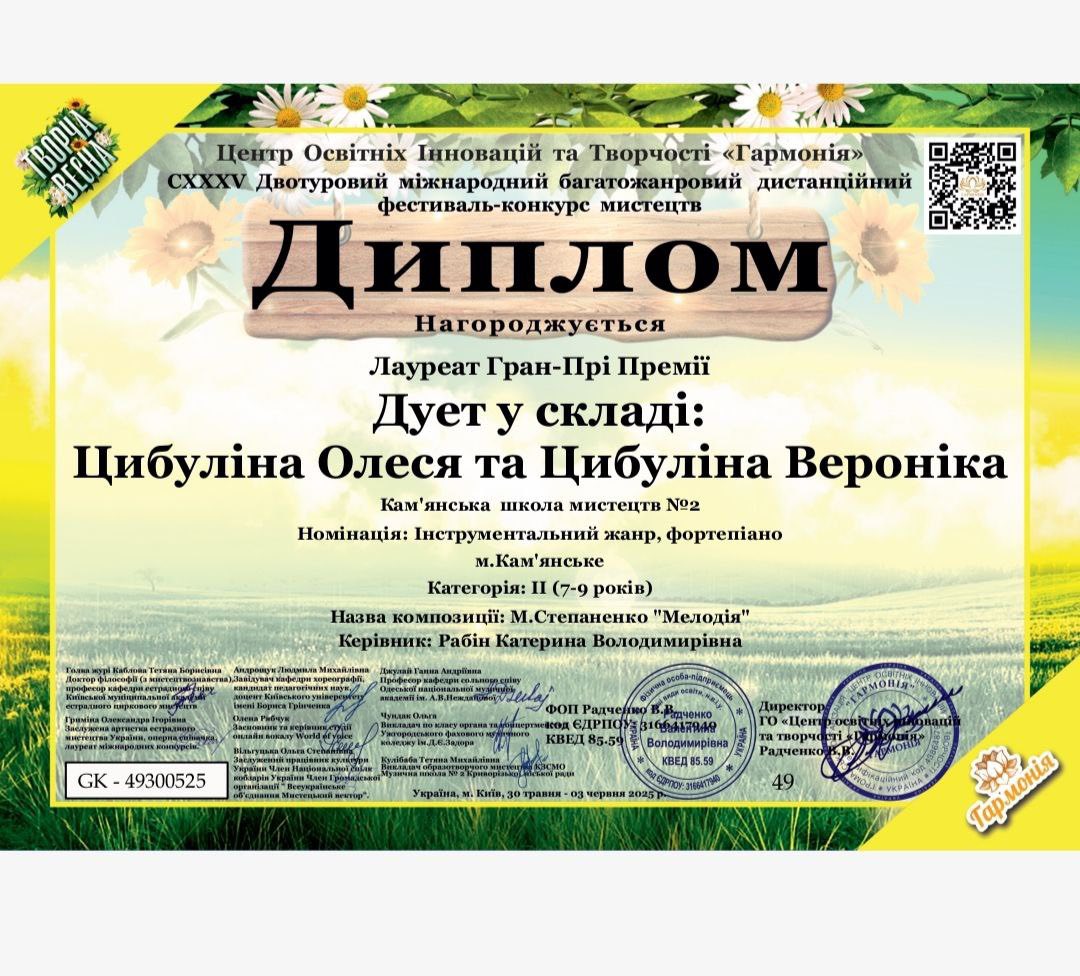 Успішною стала участь фортепіанного дуету зі школи мистецтв №2 у складі Олесі Цибуліної та Вероніки Цибуліної. Дівчатка виступили в номінації «Інструментальний жанр. Фортепіано» у ІІ віковій категорії (7-9 років) і отримала найвищу нагороду — диплом лауреата Гран-Прі! Блискуче виконання музичної композиції М. Степаненка «Мелодія» підкорило членів журі, які високо оцінили рівень виконавської майстерності сестричок. Ця перемога стала яскравим свідченням їхньої наполегливої праці та непересічного таланту.