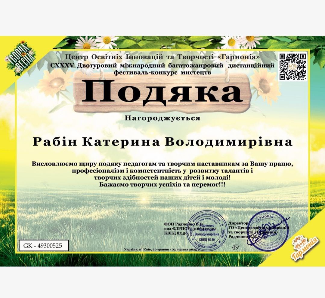 Не менш важливою є і заслуга викладача, адже за кожним успішним учнем стоїть відданий наставник. Катерина Володимирівна Рабін, яка підготувала юних лауреаток, нагороджена подякою від організаторів конкурсу за працю, професіоналізм і компетентність у розвитку талантів і творчих здібностей дітей і молоді.