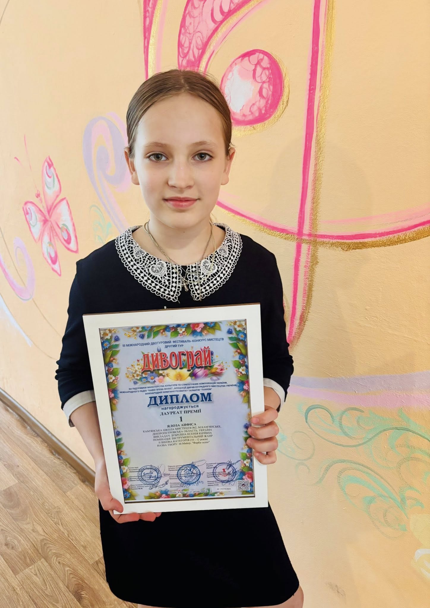 Учениця фортепіанного відділу Анфіса Ялоза стала однією з найкращих на III Міжнародному двотуровому фестивалі-конкурсі мистецтв “Дивограй”, який проводився з 24 по 27 квітня у Києві. Дівчинка, майстерно виконавши твір М. Майер “Фарби осені”, здобула диплом лауреата І премії. Анфіса змагалася у другій віковій категорії (10-12 років) у номінації “Інструментальний жанр, фортепіано”. Її викладач Ксенія Юріївна Зубріліна відзначена подякою за високу професійну майстерність, збереження культурної спадщини, підтримку та духовне збагачення молодого покоління, а також особистий вагомий внесок у розвиток культурно-естетичного виховання дітей та молоді.