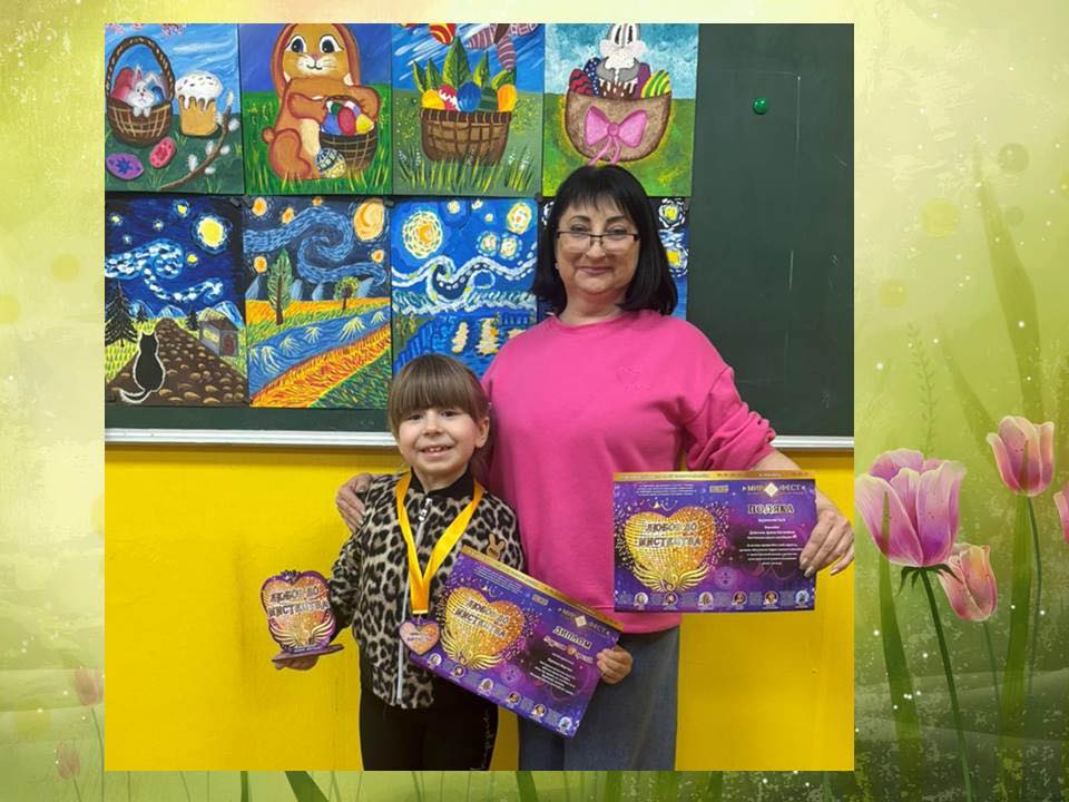 Міжнародний конкурс “Любов до мистецтва”, що проходив з 14 по 18 квітня, також приніс школі мистецтв чергову перемогу. Учениця образотворчого відділення Мар’яна Бурназа нагороджена дипломом I премії в номінації “Живопис” за свою неповторну роботу “Річка під зорями”, створену в стилі Ван Гога. Конкурс провела фестивальна творча організація “Мир Фест” за підтримки Департаменту культури і туризму Полтавської ОВА, Національної спілки композиторів та Асоціації діячів естрадного мистецтва України. Окрім викладача Ірини Дзінгель, подяки отримали і батьки Мар’яни за віру і духовну підтримку своєї обдарованої дитини.