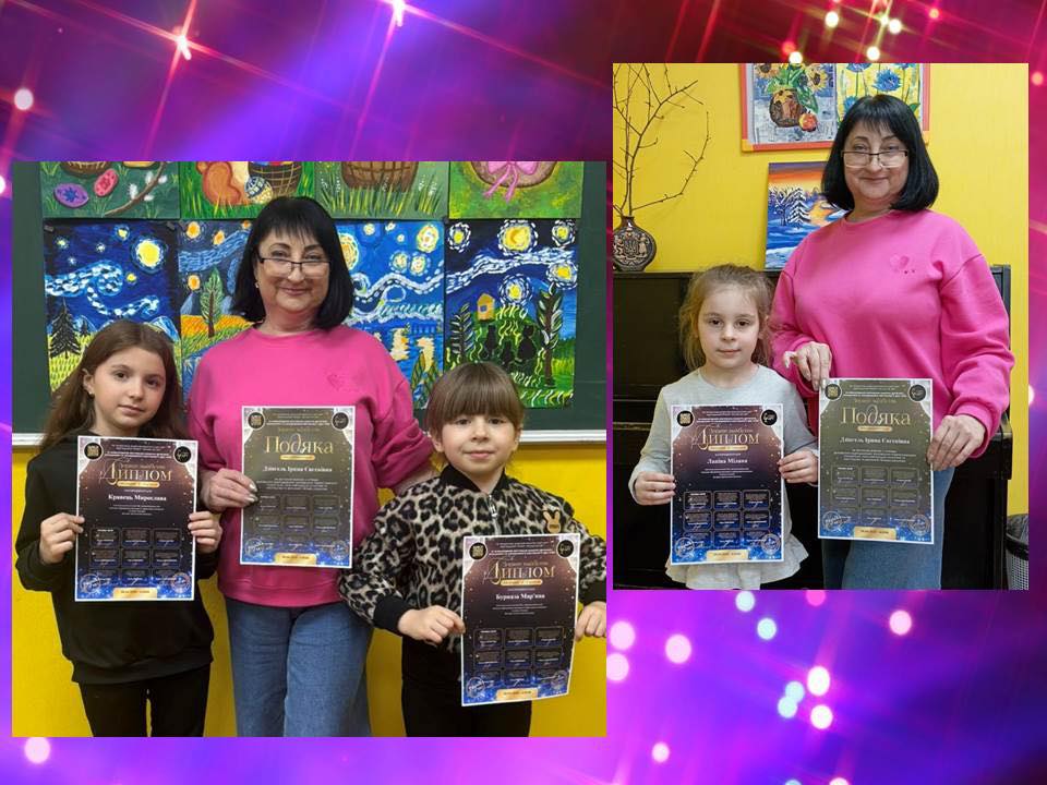 Учениці образотворчого відділення справили позитивне враження на суддівську колегію ІІІ Міжнародного фестивалю-конкурсу дитячого, юнацького та молодіжного мистецтва “Зоряне майбутнє”. Організатором виступила ГО “Культурно-освітній простір “СТАРТ-АРТ” та мистецький проєкт Splash of art. У номінації “Декоративно-прикладне та образотворче мистецтво” блискучі результати показали Мирослава Кравець, Мілана Лапіна та Мар’яна Бурназа. Юні художниці стали лауреатами I ступеня. Викладач Ірина Дзінгель отримала подяку за вагомий внесок у справу духовного відродження, виховання молодого покоління, популяризацію культури та мистецтва, а також високий професіоналізм.