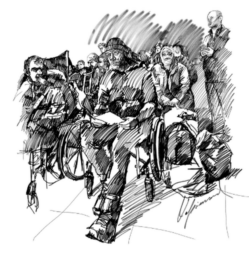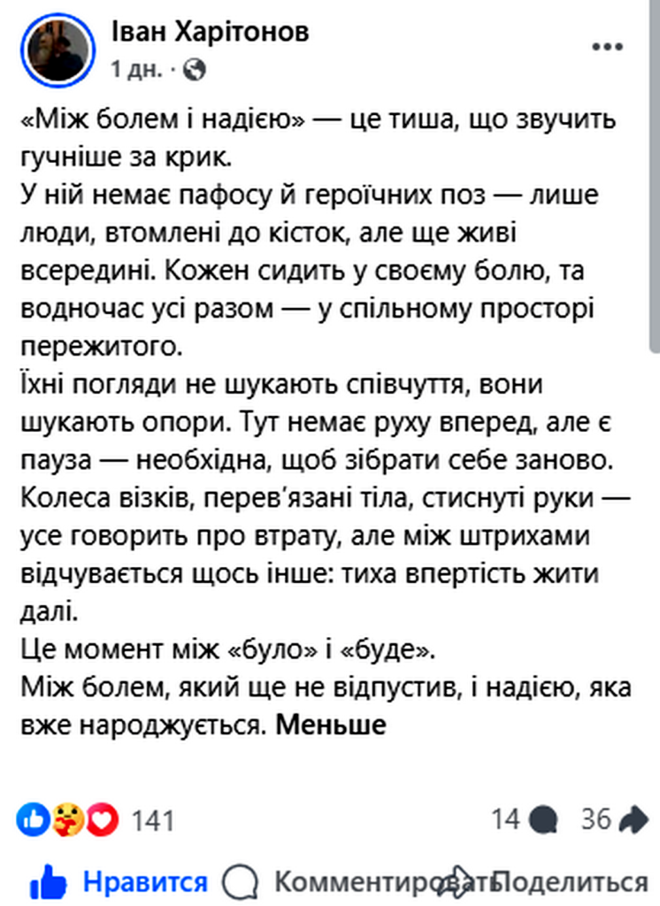 Іван Харитонов – художник та викладач Кам’янської художньої школи ім. Роберта Лісовського. Влітку цього року приєднався до ЗСУ і став на захист України. В грудні отримав тяжке поранення. Першу медичну допомогу йому надавали у Харківський області, очікував (а може вже й переведений) на лікування до іншого регіону. Ось його думки (в словах та на малюнку) коли художник перебував серед таких же поранених як і він сам: