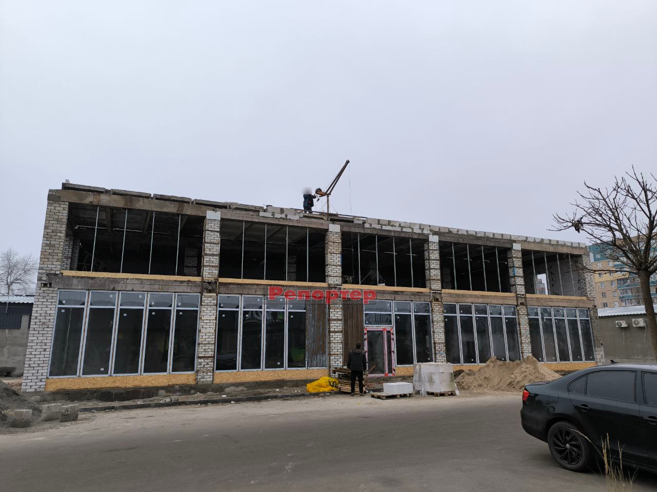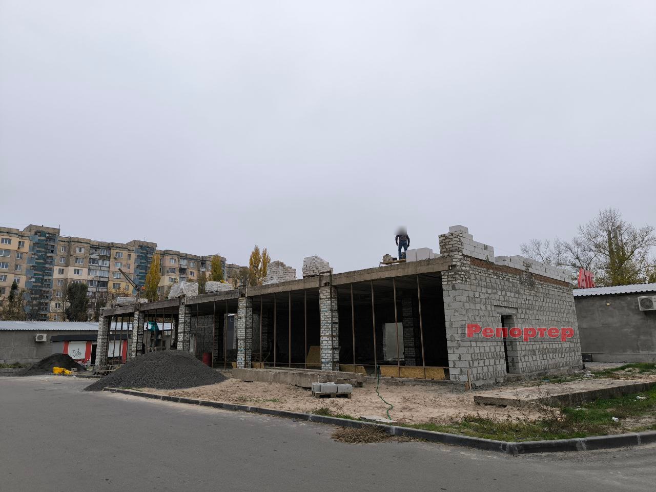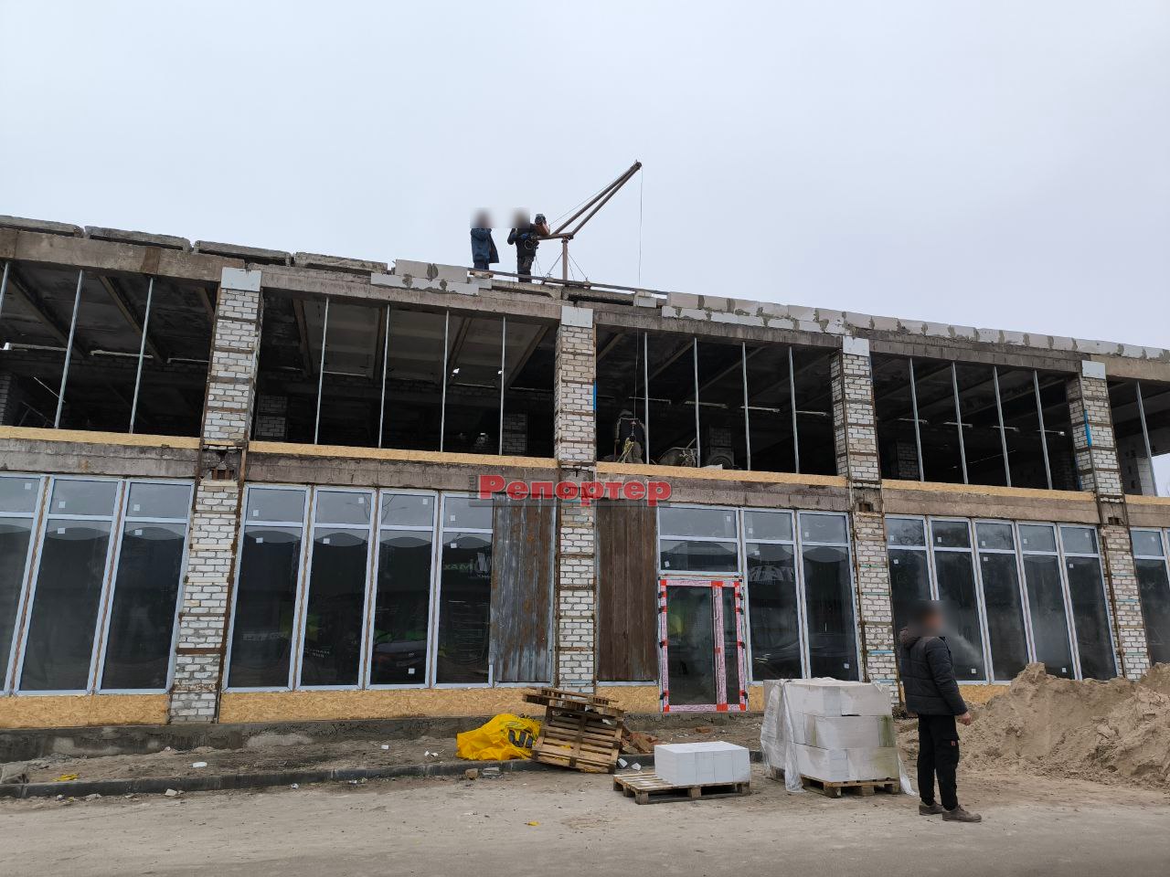 Ми побували на будмайданчику 19 грудня. Тут панує типова робоча атмосфера. На місці, де працюють декілька людей, побудували двоповерхову комерційну будівлю з цегли та газоблоків. Перекриття між першим і другим поверхами, а також дах, виконані з бетонних плит. Роботи ще далекі від завершення, але основні конструкції вже зведено. На першому поверсі встановлені великі панорамні вікна та двері. Готується скління другого поверху.