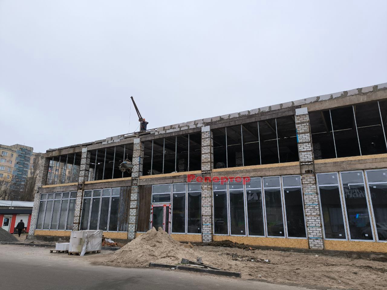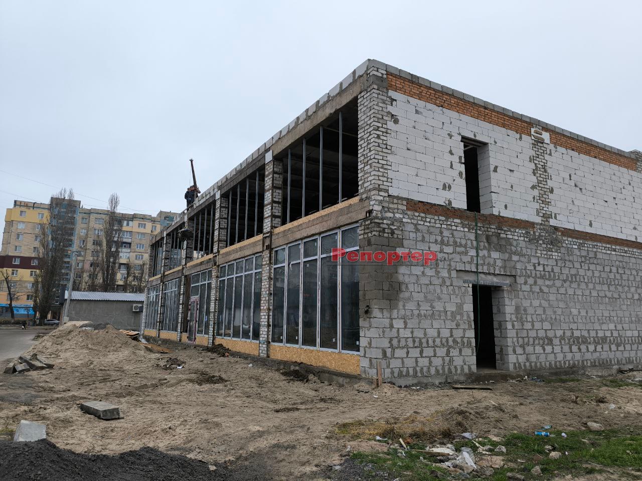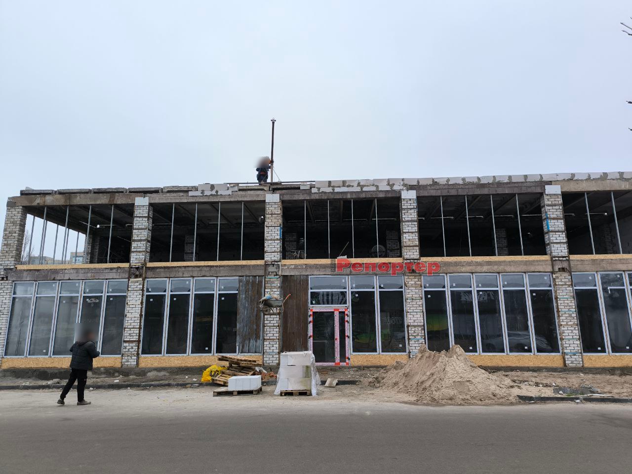 Ми побували на будмайданчику 19 грудня. Тут панує типова робоча атмосфера. На місці, де працюють декілька людей, побудували двоповерхову комерційну будівлю з цегли та газоблоків. Перекриття між першим і другим поверхами, а також дах, виконані з бетонних плит. Роботи ще далекі від завершення, але основні конструкції вже зведено. На першому поверсі встановлені великі панорамні вікна та двері. Готується скління другого поверху.