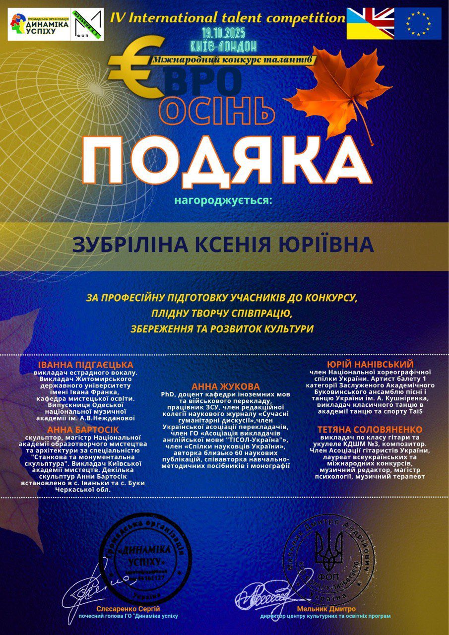 Організатори нагородили їхнього викладача Ксенію Юріївну Зубріліну подякою за професійну підготовку учасників до конкурсу, плідну творчу співпрацю, збереження та розвиток культури.