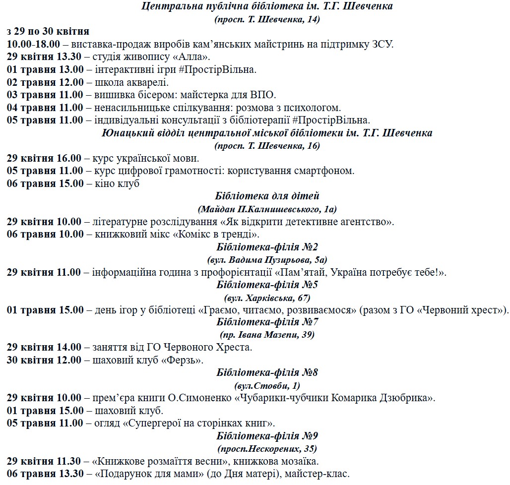 Справжнім осередком творчості та спілкування є Центральна публічна бібліотека ім. Т. Шевченка. Там працюють художні студії, школа акварелі, проводять інтерактивні ігри, психологічні зустрічі та консультації з бібліотерапії. Також триватиме виставка-продаж виробів кам’янських майстринь на підтримку ЗСУ.