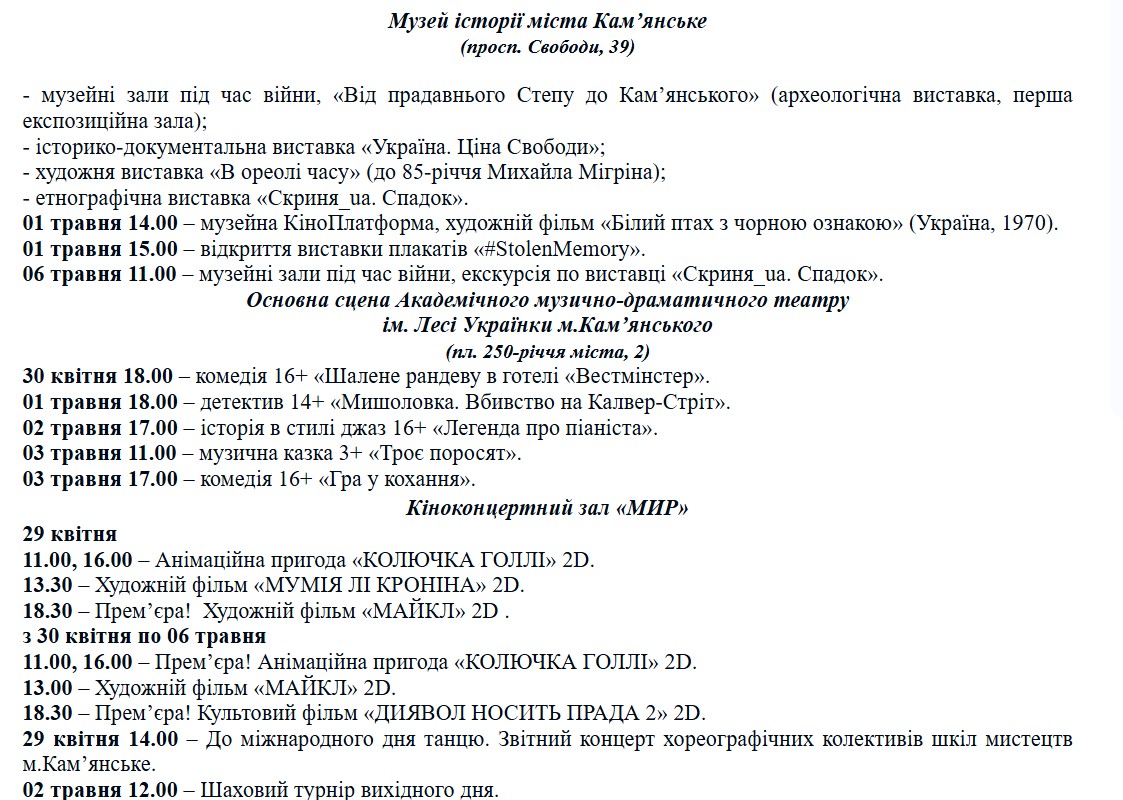 Куди піти в Кам’янському: програма заходів з 29 квітня по 6 травня
