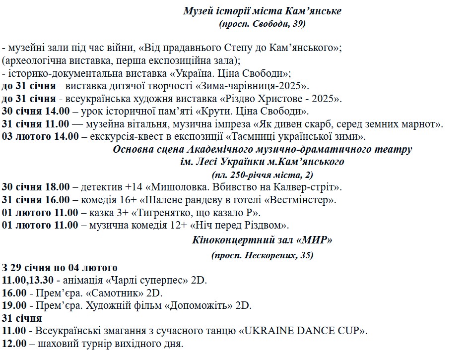 Куди піти в Кам’янському: програма заходів з 29 січня по 4 лютого