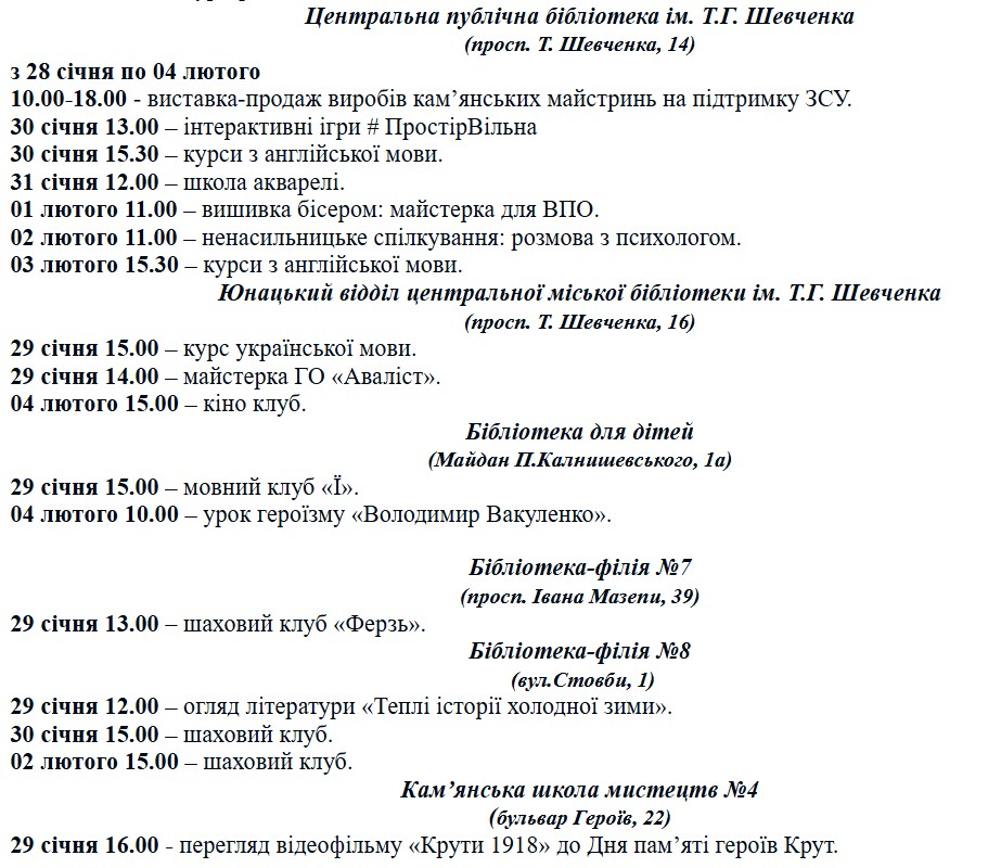 Центральна бібліотека та її філії запрошують на виставку-продаж виробів кам’янських майстринь на підтримку ЗСУ, інтерактивні ігри, розмову з психологом. Також є можливість відвідати мовні, кіно- та шахові клуби.