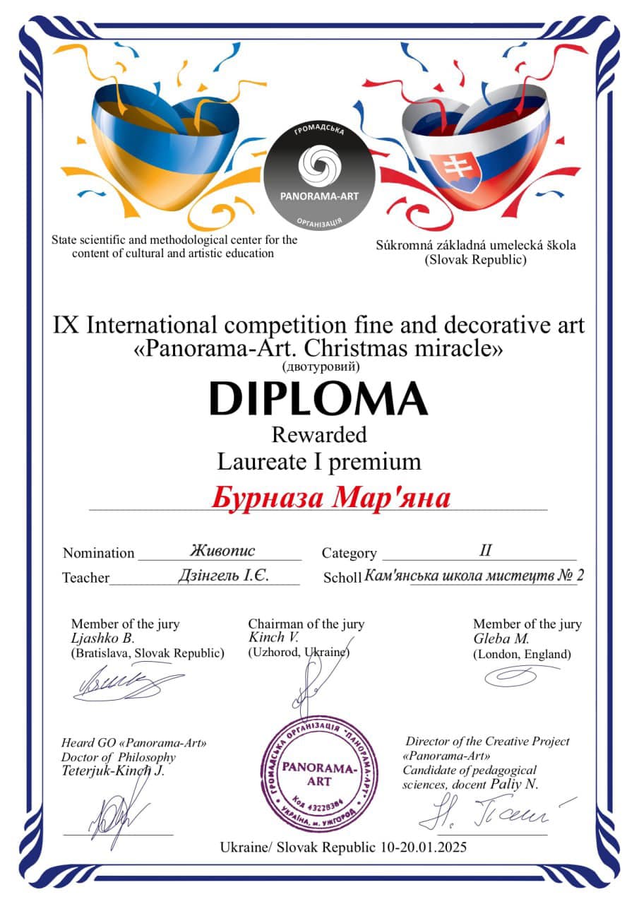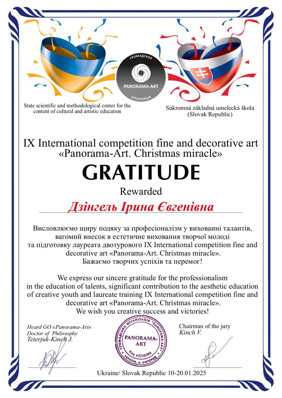 Творча робота маленької художниці підкорила журі ІХ Міжнародного конкурсу образотворчого та декоративно-прикладного мистецтва “Panorama-Аrt. Christmas miracle” (Україна-Словаччина). Його засновник – громадська організація “Panorama-Art” .