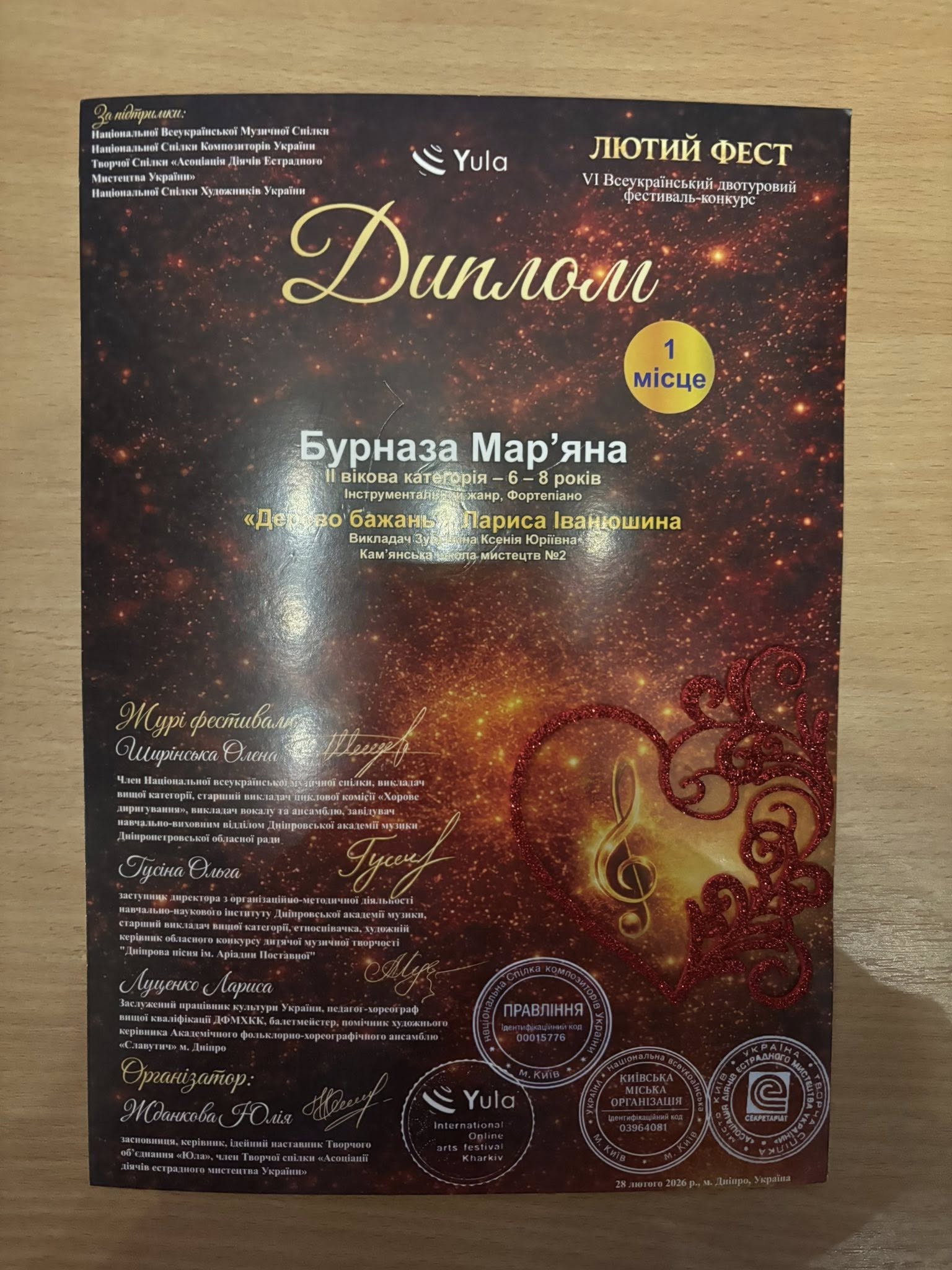 Яскраво заявила про себе учениця Кам’янської школи мистецтв № 2 – маленька піаністка Мар’яна Бурназа. Своїм чудовим виконанням п’єси сучасного українського композитора Лариси Іванюшиної «Дерево бажань» талановита дівчинка підкорила членів журі та глядачів у залі. Мар’яна здобула диплом лауреата І премії в номінації «Інструментальний жанр. Фортепіано» (І вікова категорія, 6–8 років).
