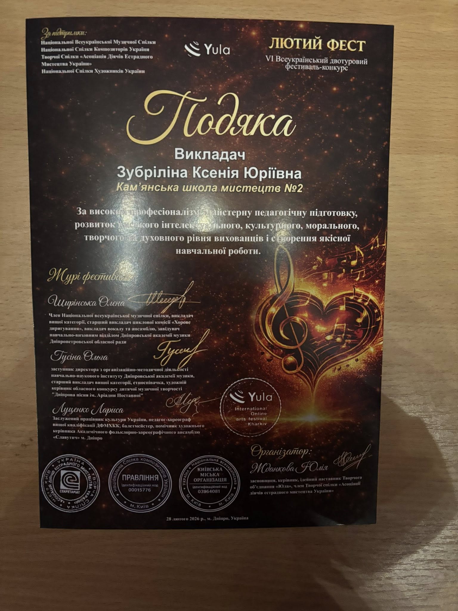 Нагороду отримала й наставниця піаністки Ксенія Зубріліна. Викладачу від організаторів було вручено подяку за високий професіоналізм, майстерну педагогічну підготовку, розвиток високого інтелектуального, культурного, морального, творчого та духовного рівня вихованців і створення якісної навчальної роботи.