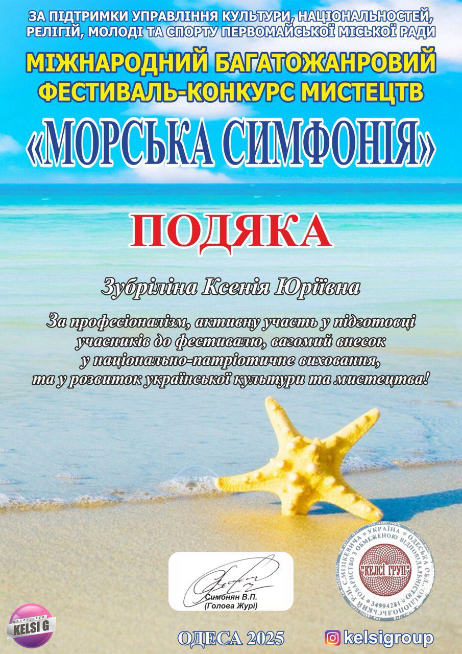 Викладач Ксенія Зубріліна отримала подяку від організаторів “Морської симфонії” за професіоналізм, активну участь у підготовці учасниці до фестивалю, вагомий внесок у національно-патріотичне виховання, та у розвиток української культури та мистецтва.