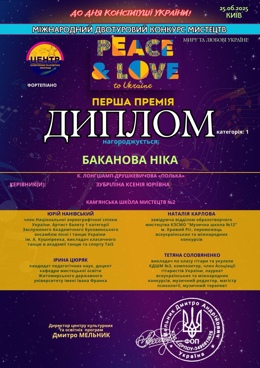Мистецтво – це універсальна мова, що промовляє безпосередньо до серця, долаючи будь-які кордони та не потребуючи перекладу. Воно володіє надзвичайною силою виражати найглибші людські почуття та ідеали: прагнення миру, безмежну любов і непохитну віру в світле майбутнє. Саме з метою утвердження цих вічних цінностей 25 червня відбувся Міжнародний двотуровий конкурс мистецтв PEACE & LOVE TO UKRAINE, присвячений Дню Конституції України.