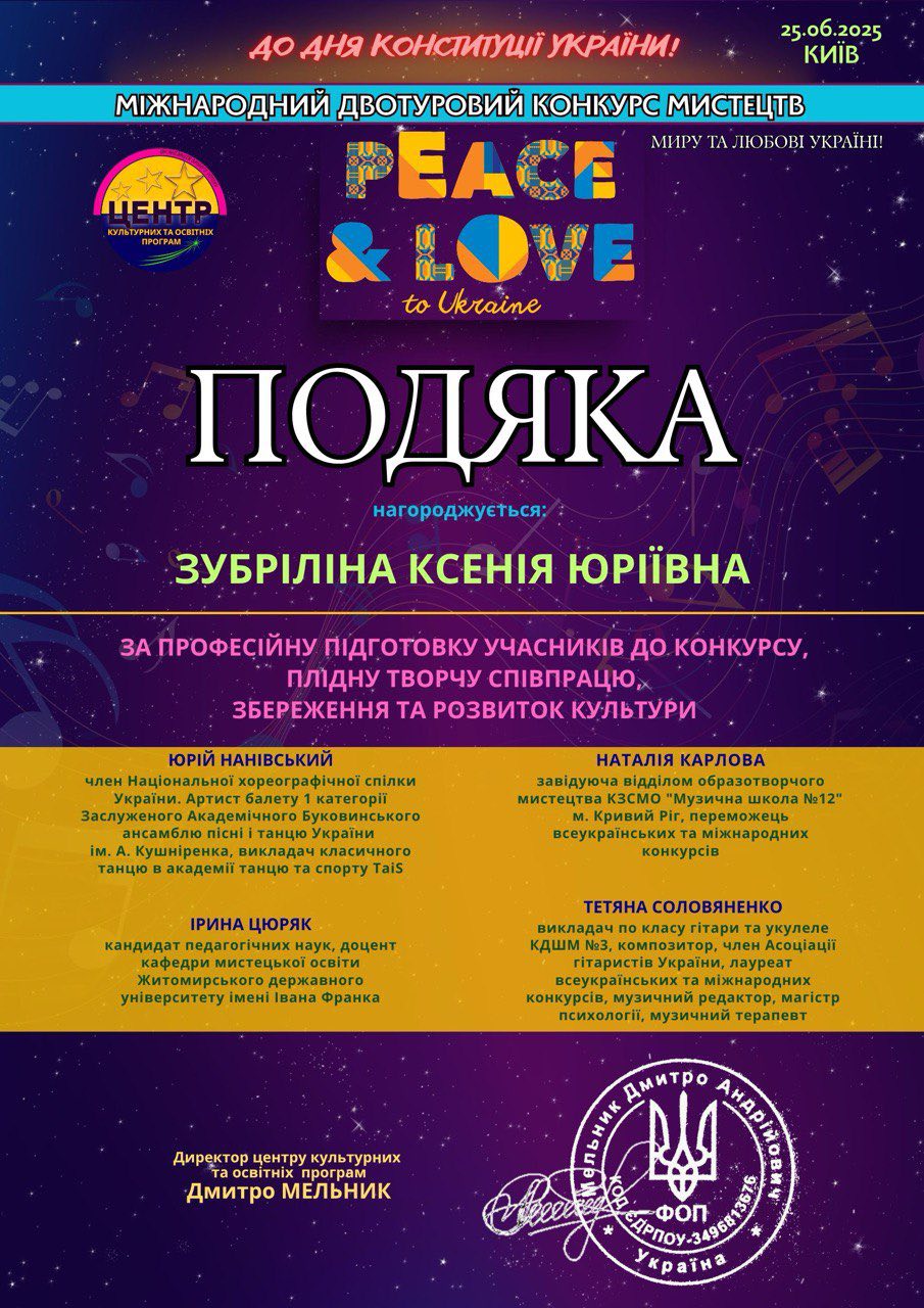 Викладач Ксенія Зубріліна отримала подяку за професійну підготовку учасниці до конкурсу, плідну творчу співпрацю, збереження та розвиток культури.