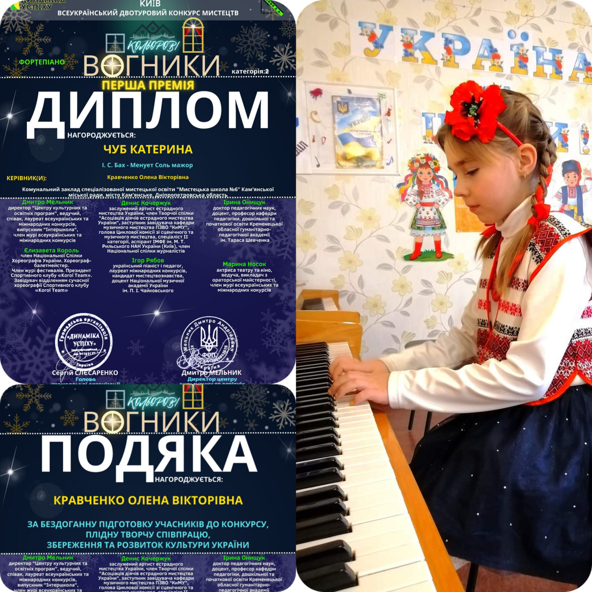 - Катерина Чуб (викладач Олена Кравченко) – диплом І ступеня (фортепіано);