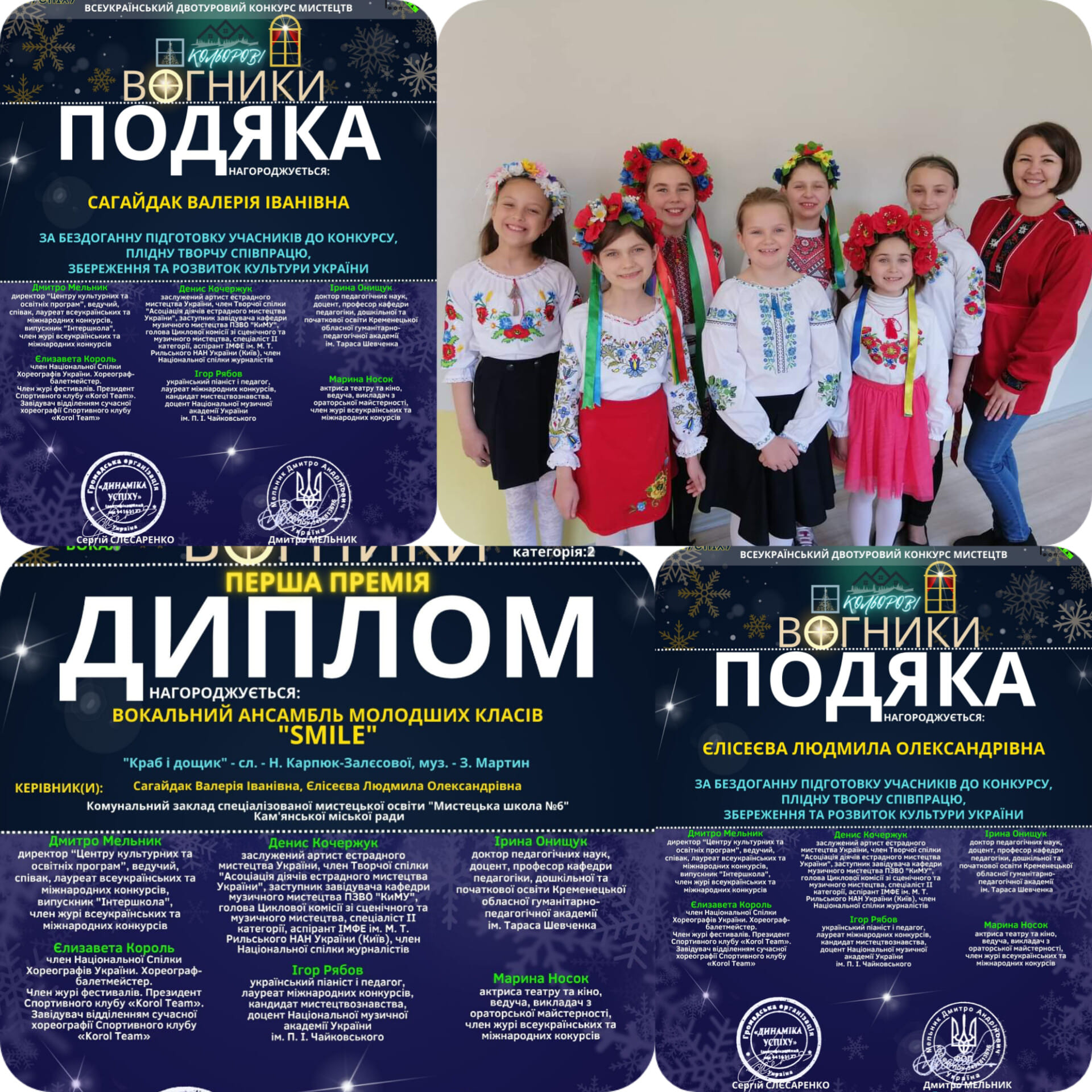 - вокальний ансамбль молодших класів “Smile” (керівник Валерія Сагайдак, концертмейстер Людмила Єлісеєва) – диплом І ступеня;