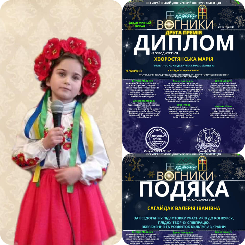 - Марія Хворостянська (викладач Валерія Сагайдак) – диплом ІІ ступеня (академічний вокал).