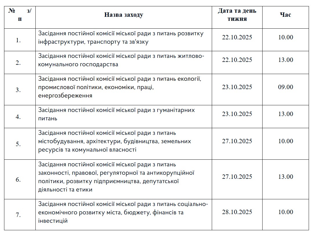 Засідання постійних комісій КМР пройдуть з 22 по 28 жовтня.