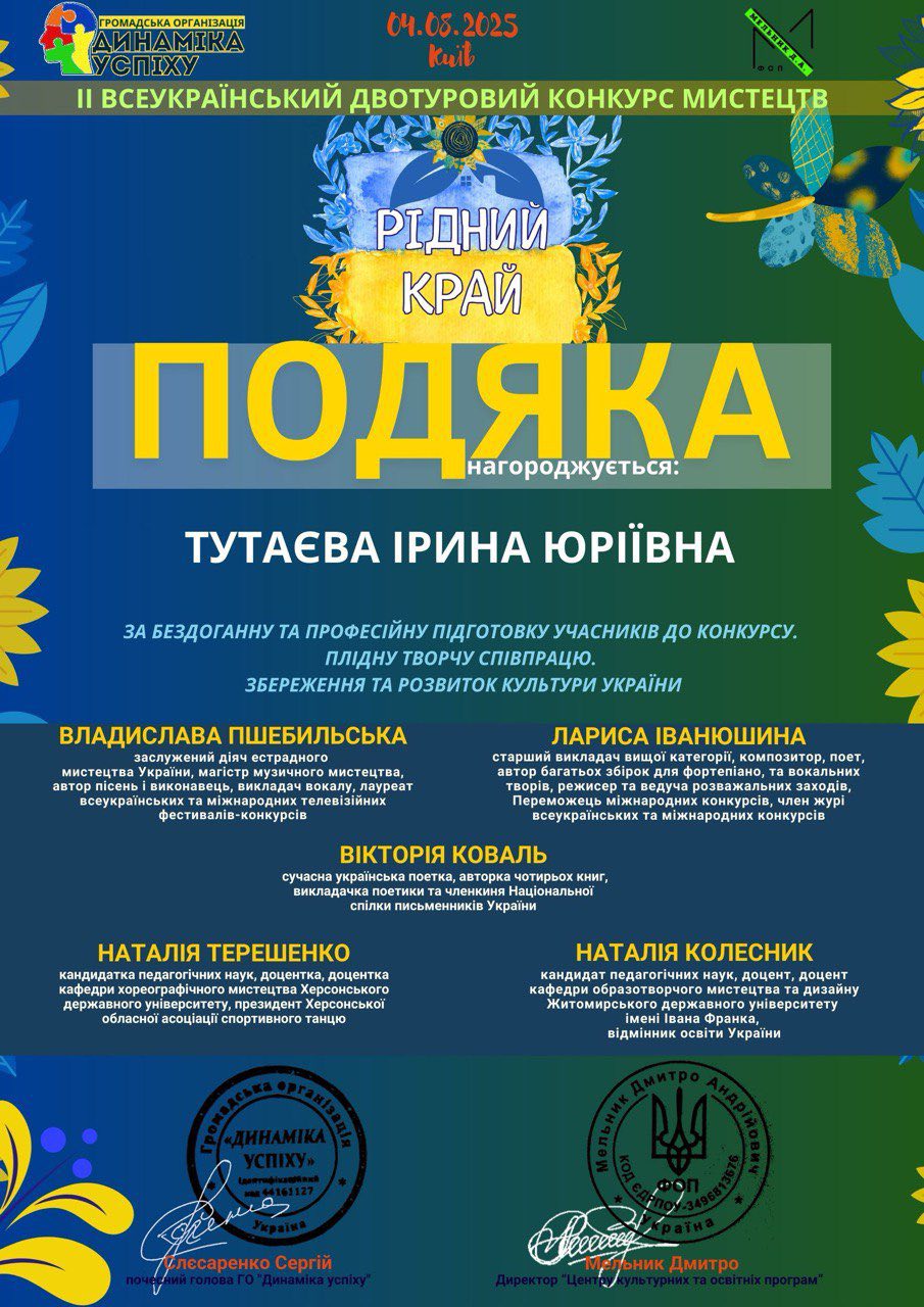 Викладач хореографічного відділення Ірина Тутаєва отримала подяку за бездоганну та професійну підготовку учасників до конкурсу, плідну творчу співпрацю, збереження та розвиток культури України.