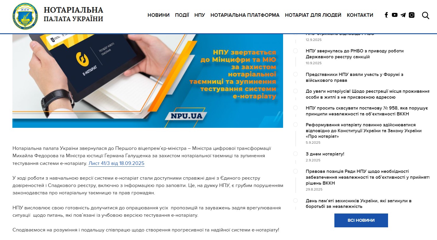 Нотаріальна палата України (НПУ) звернулася до першого віцепрем’єр-міністра – міністра цифрової трансформації Михайла Федорова та міністра юстиції Германа Галущенка з проханням зупинити тестування системи е-нотаріату та захистити нотаріальну таємницю.