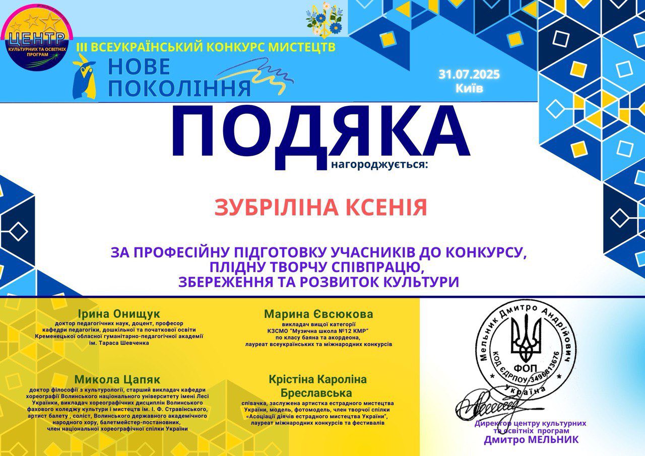 Організатори конкурсу відзначили викладача Ксенію Зубріліну подякою за професійну підготовку учасниці, плідну творчу співпрацю, збереження та розвиток культури.