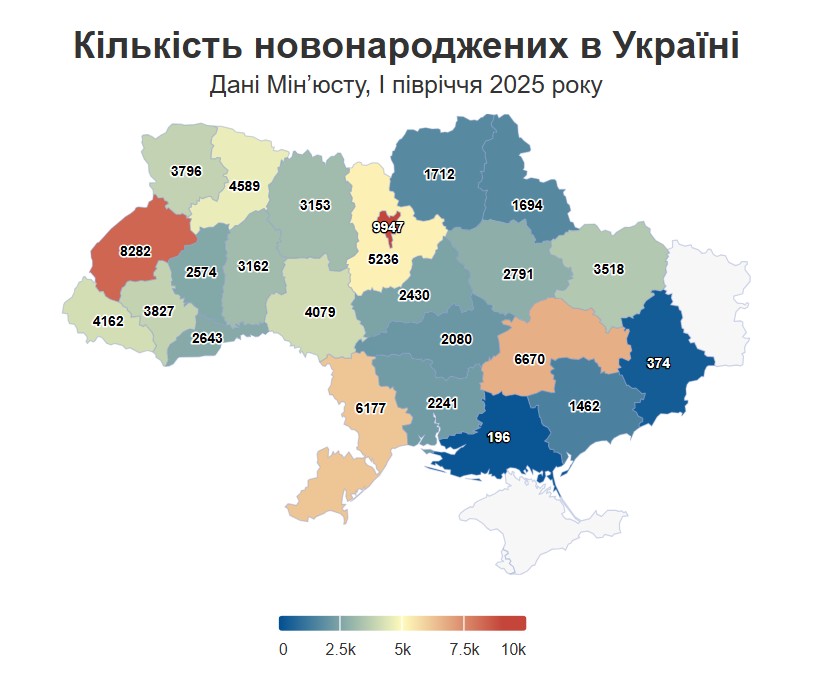 За перше півріччя 2025-го народилося 86 795 немовлят, що майже дорівнює показнику за аналогічний період минулого року (87 655). Однак, загальна тенденція є невтішною: за останні десять років народжуваність в Україні зменшилася у 2,2 рази. Якщо у 2016 році щомісяця народжувалося в середньому 32 тисячі немовлят, то цьогоріч цей показник становить лише 14 тисяч.