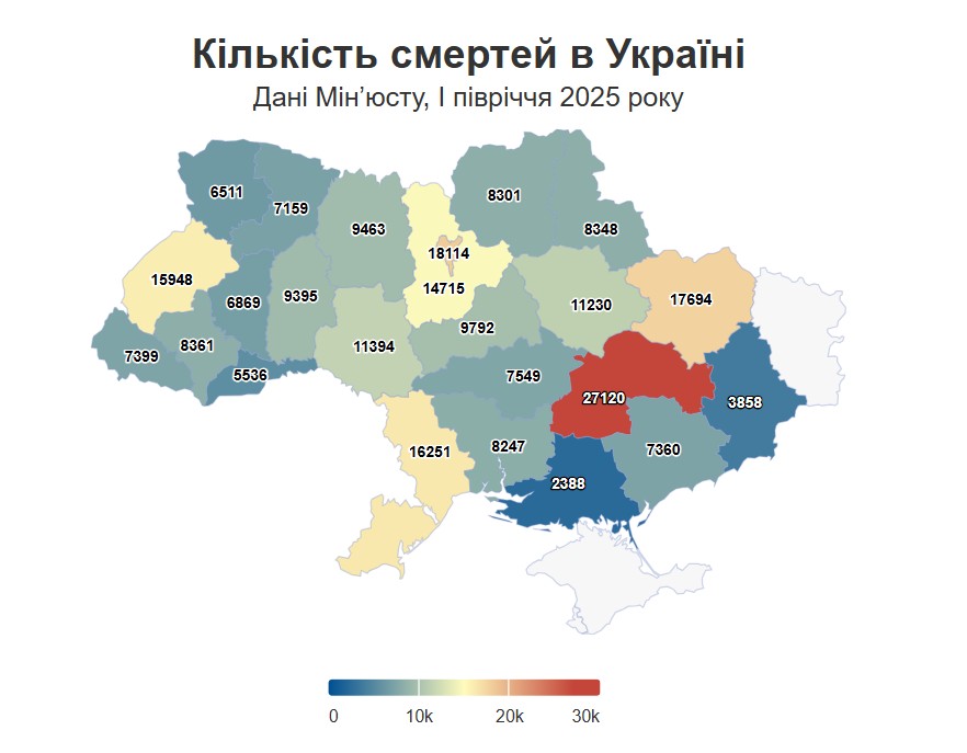 Дніпропетровщина утримує першість за кількістю смертей, де помирає кожна дев’ята людина в Україні (27 120 померлих). Серед антилідерів також Київ (18 114 смертей) та Харківщина (17 694 померлих).