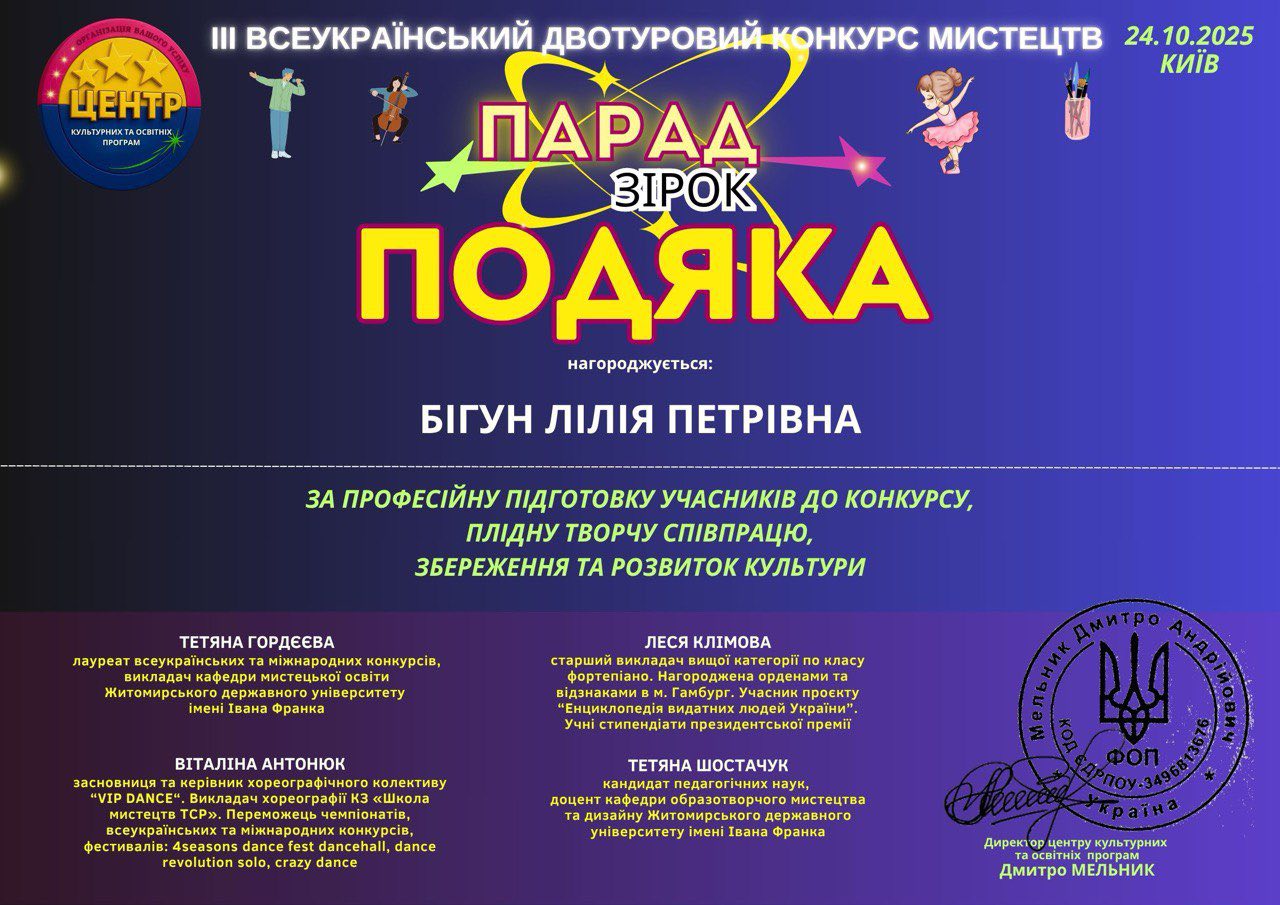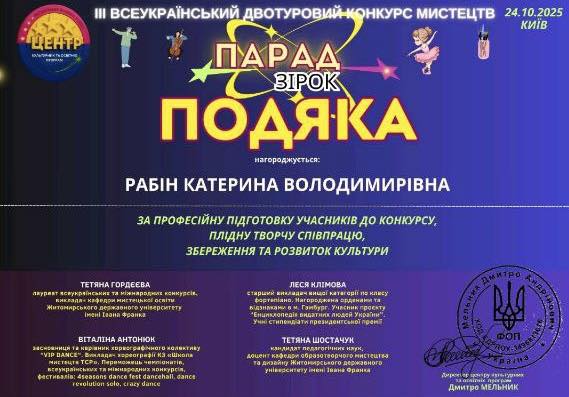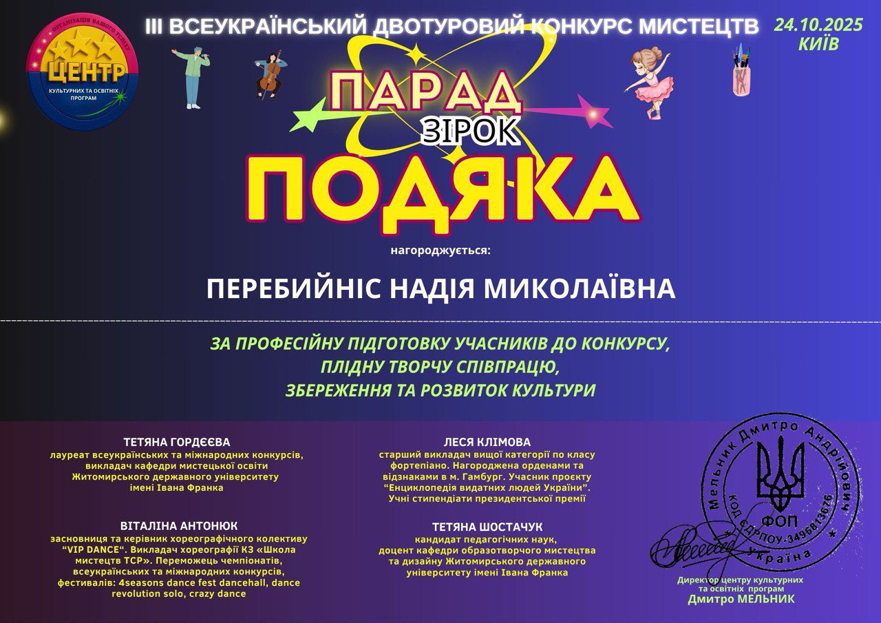 Подія, що вже вкотре підтвердила невичерпну силу таланту української молоді. 24 жовтня відбувся ІІІ Всеукраїнський двотуровий конкурс мистецтв “Парад зірок” (Київ), який проходив у дистанційному форматі. Організатор – Центр культурних та освітніх програм.