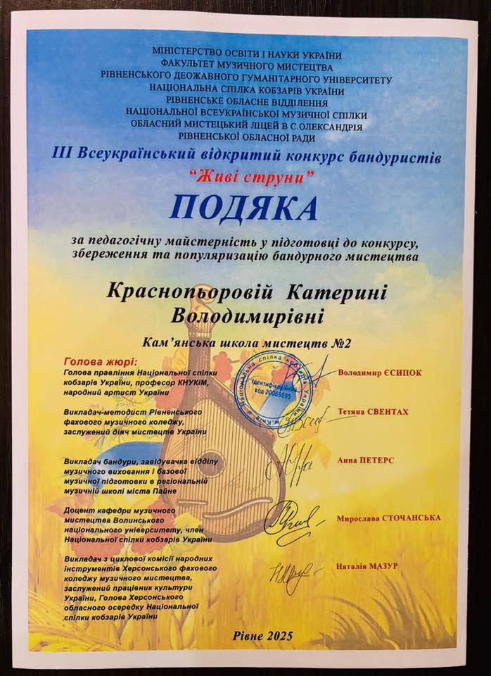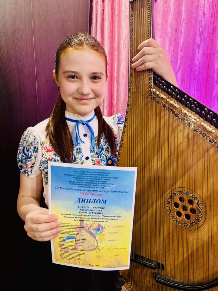 Серед учасників (а їх було 75 у номінації “Соліст-інструменталіст”) відзначилась учениця оркестрового відділу Камʼянської школи мистецтв № 2 Євгенія Зубріліна. Під керівництвом викладача Катерини Краснопьорової дівчинка продемонструвала високий рівень виконавської майстерності. Її виступ, що включав твори сучасних українських композиторів – “Колискову” Євгенії Дзюби та “Пролітаючи над містом” Маргарити Павлової, був позитивно оцінений журі.