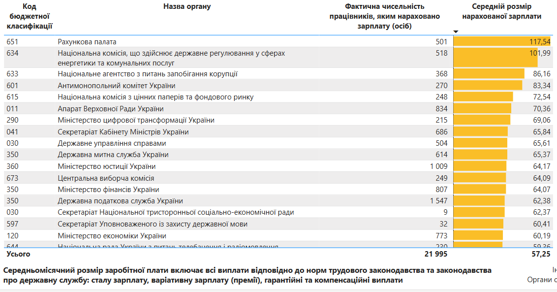 Найвищу середню зарплату отримали співробітники Рахункової палати – 117,5 тис. грн на місяць. Штат установи налічує 501 особу.