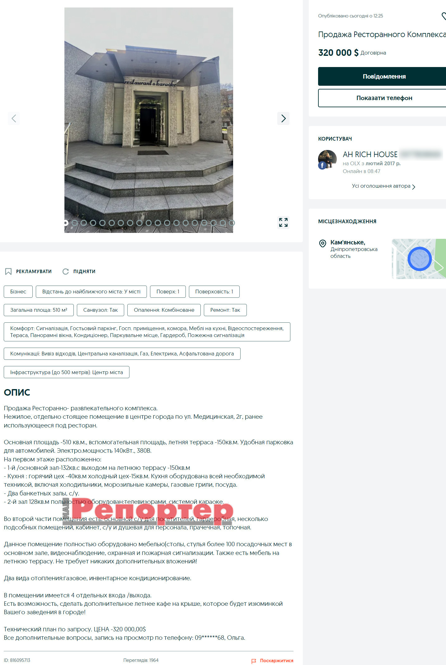Оголошення про продаж закладу опубліковано 7 березня на OLX. Тому, хто захоче придбати нерухомість, доведеться викласти чималеньку суму – 320 000 дол. США. Можна і поторгуватися, адже вказано, що ціна договірна.