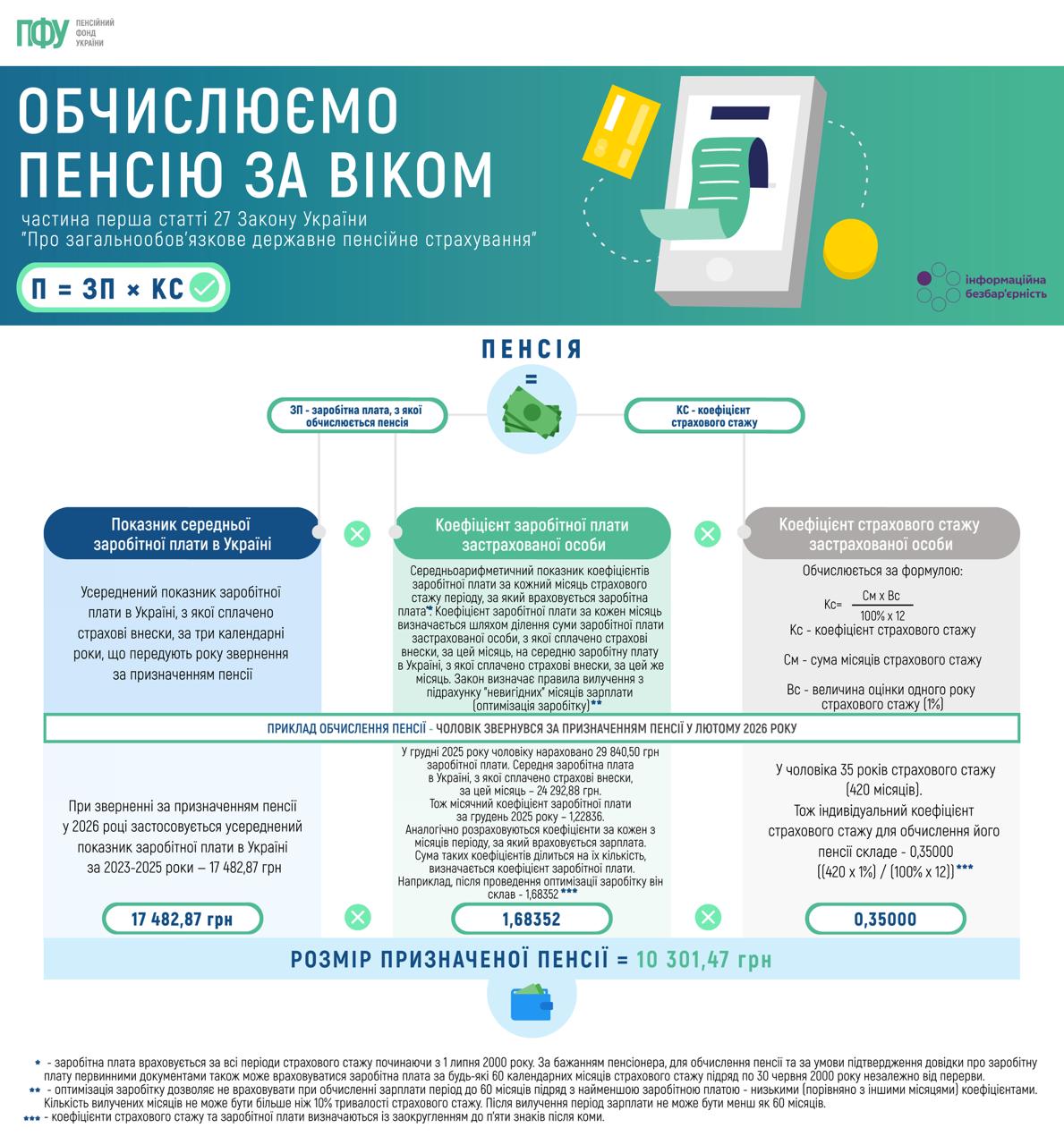 Приклад обчислення пенсії за віком: чоловік звернувся за призначенням пенсії у лютому 2026 року