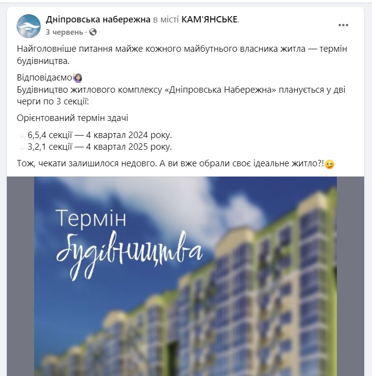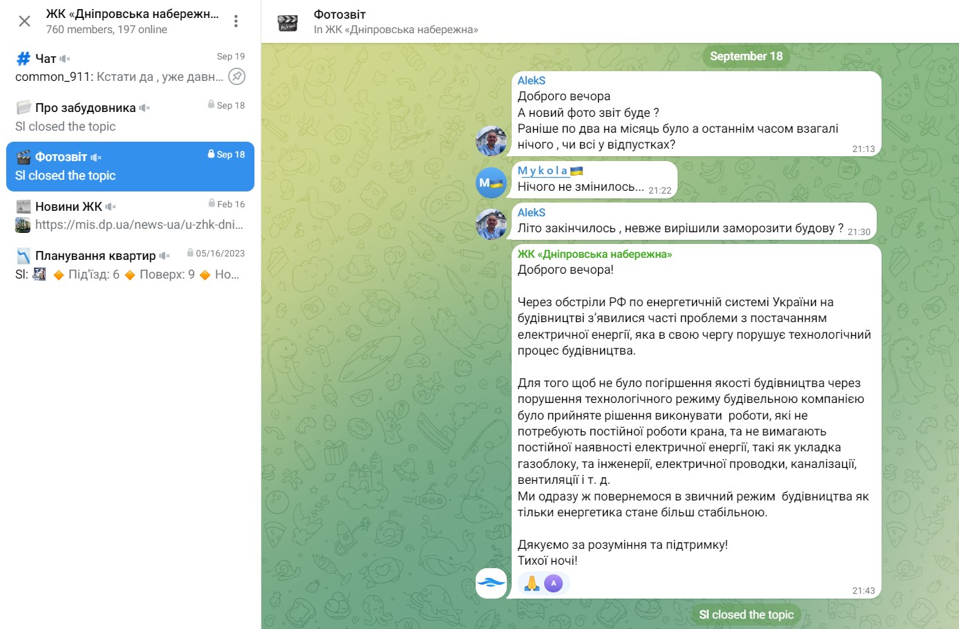 Раніше за динамікою будівництва можна було стежити на телеграм-каналі забудовника. Проте вже протягом декількох місяців такої інформації немає. Останній фотозвіт було опубліковано 4 червня. Схвильовані підписники стати питати, що сталося. Адміністратор телеграм-каналу ЖК “Дніпровська набережна” 18 вересня відповів таке: