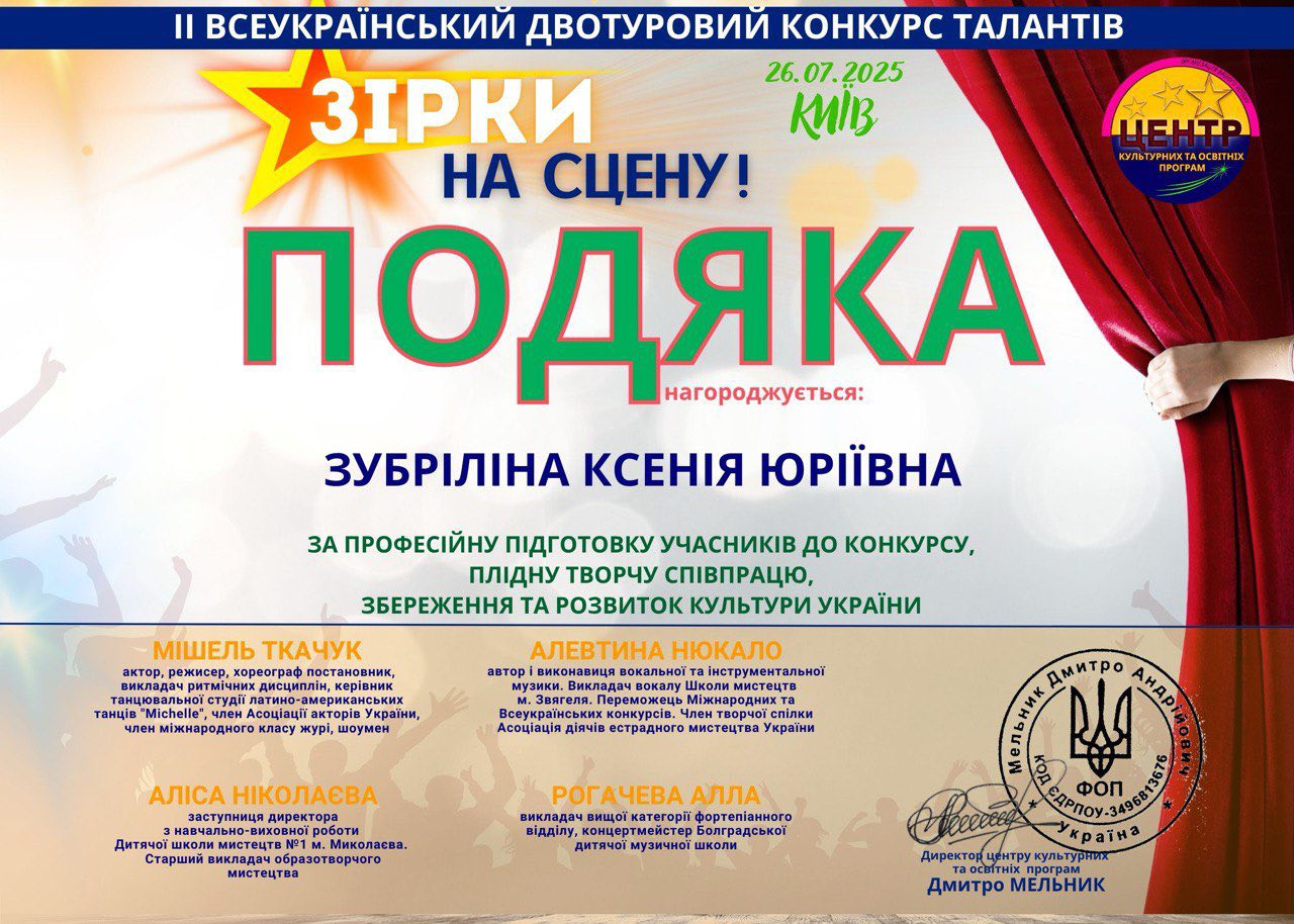 Викладач Ксенія Зубріліна відзначена подякою від організаторів за професійну підготовку учасника до конкурсу, плідну творчу співпрацю, збереження та розвиток культури.