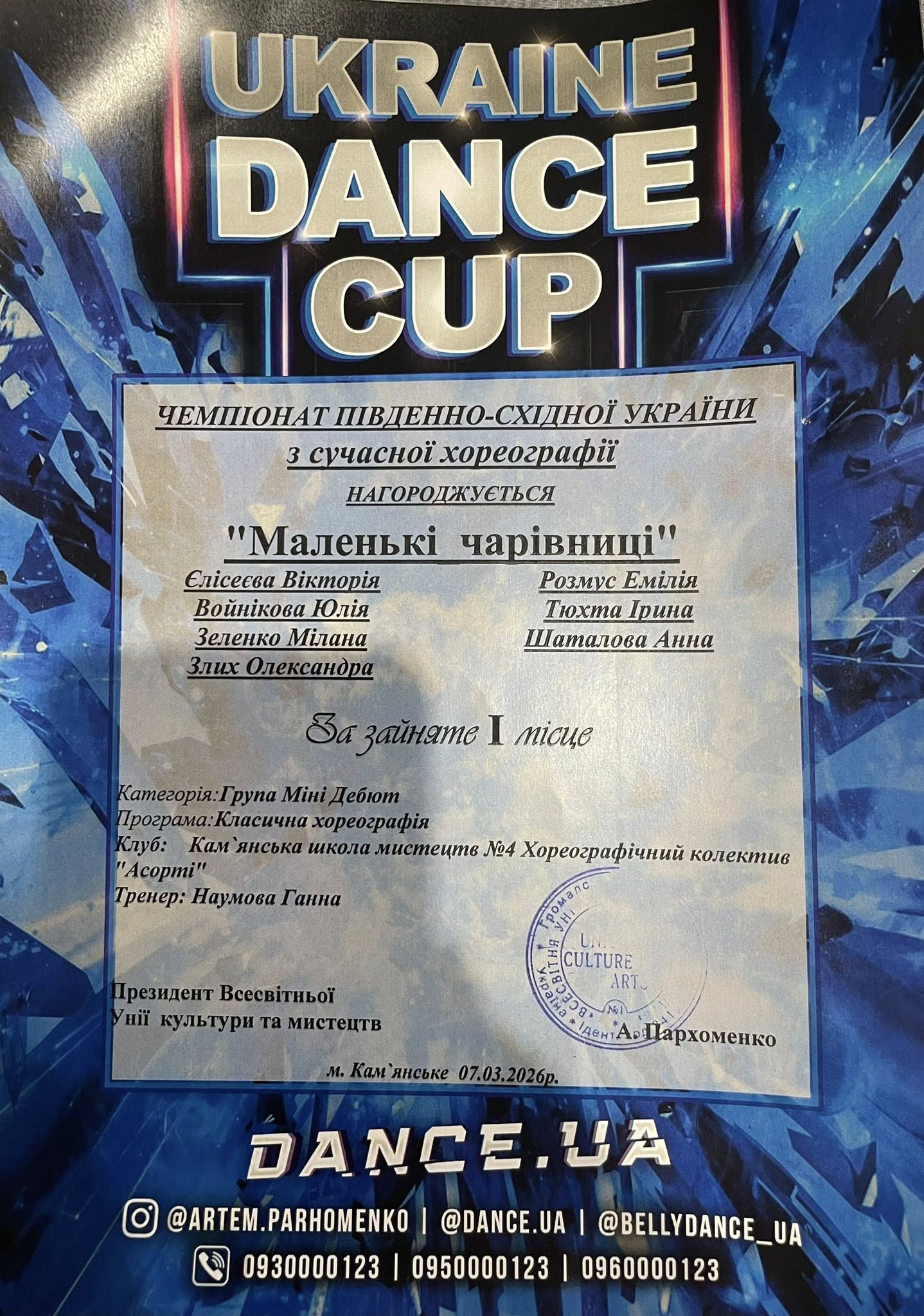 Вагомих результатів досяг і хореографічний ансамбль «Асорті». 7 березня у ККЗ «Мир» відбувся чемпіонат Південно-Східної України із сучасної хореографії UKRAINE DANCE CUP – 2026. Танцювальні змагання, що зібрали чимало колективів, провела ГО “Всесвітня унія культури та мистецтв”.