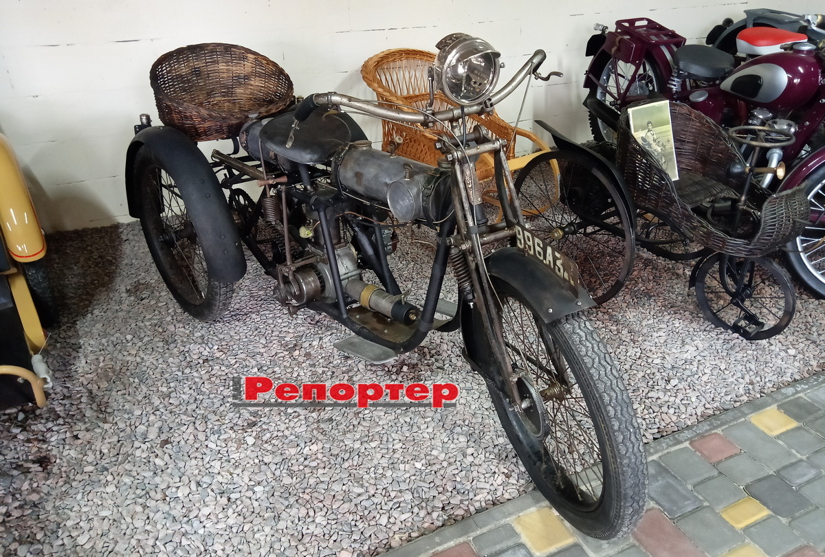 Цей французький триколісний мотоцикл було випущено у 1902 році. Він працює на бензині, об’єм двигуна – 500 см3. Мотоцикл зараз на ходу (як і більшість колекції Олександра).