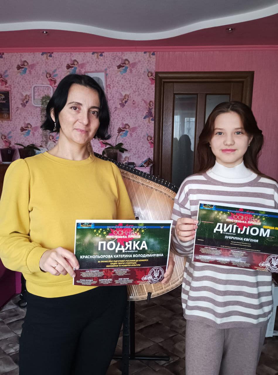 Учениця оркестрового відділу Камʼянської школи мистецтв № 2 Євгенія Зубріліна взяла участь в номінації “Народні інструменти. Бандура”. За зразкове виконання композиції Маргарити Павлової “Хвилююча мить” дівчинка відзначена дипломом першої премії. Викладач Катерина Краснопьорова отримала подяку за професійну підготовку учасниці до конкурсу, плідну творчу співпрацю, збереження та розвиток культури.