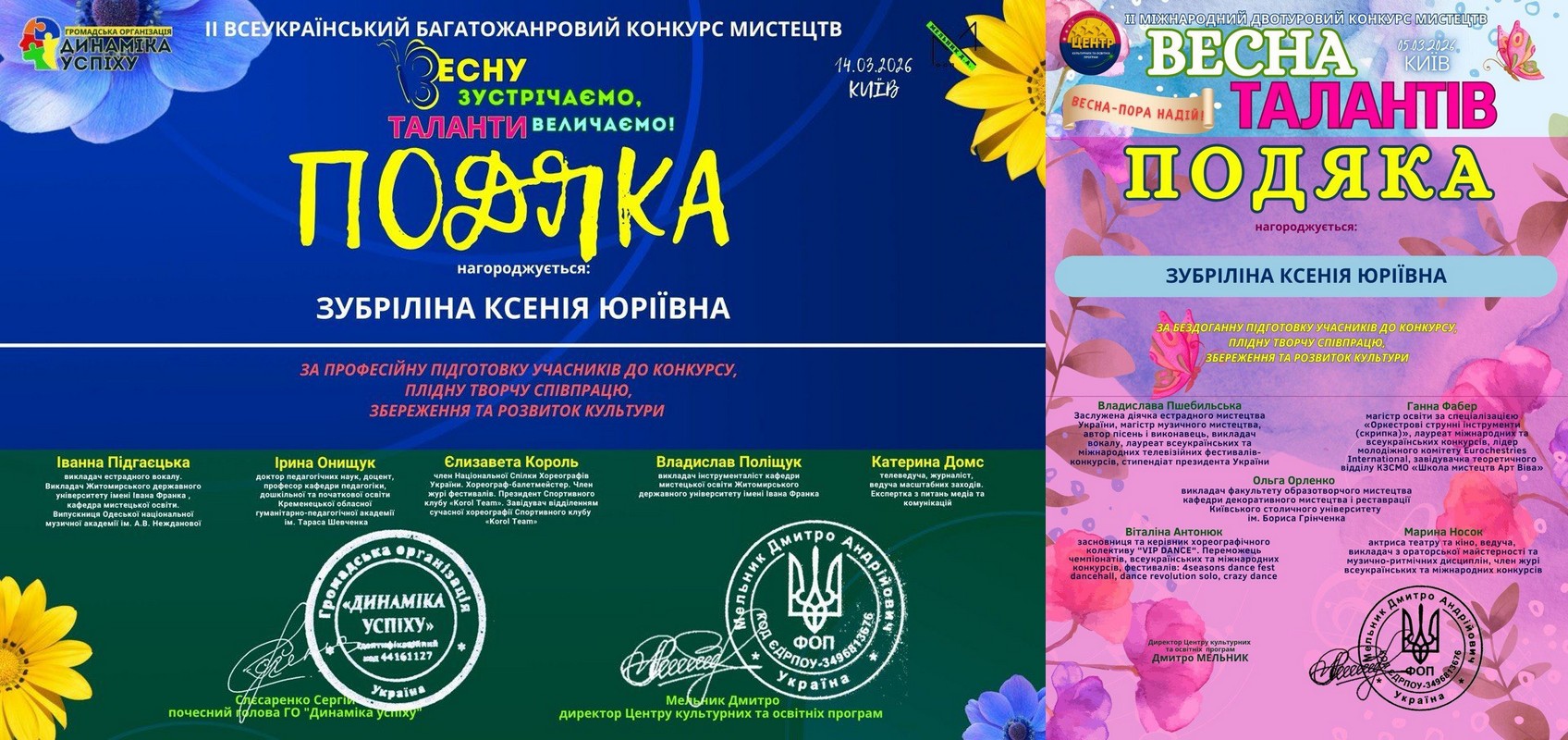 Викладач Ксенія Зубріліна отримала від організаторів подяки за професійну підготовку учасниць до конкурсів, плідну творчу співпрацю, збереження та розвиток культури.