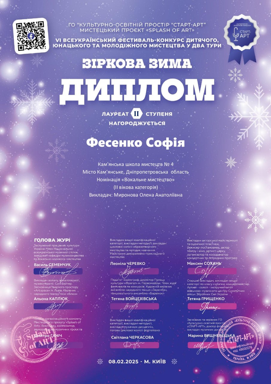 Учениця класу сольного співу Кам’янської школи мистецтв № 4 проявила вокальний талант на VI Всеукраїнському багатожанровому дистанційному фестивалі-конкурсі мистецтв “Зіркова зима“. Його організатором виступила ГО “Культурно-освітній простір “СТАРТ-АРТ” в рамках Мистецького проєкту “SPLASH of ART”. У конкурсі, що відбувся 8 лютого у Києві, взяли участь музиканти, вокалісти, художники, майстри декоративно-ужиткового мистецтва, хореографічні колективи тощо.