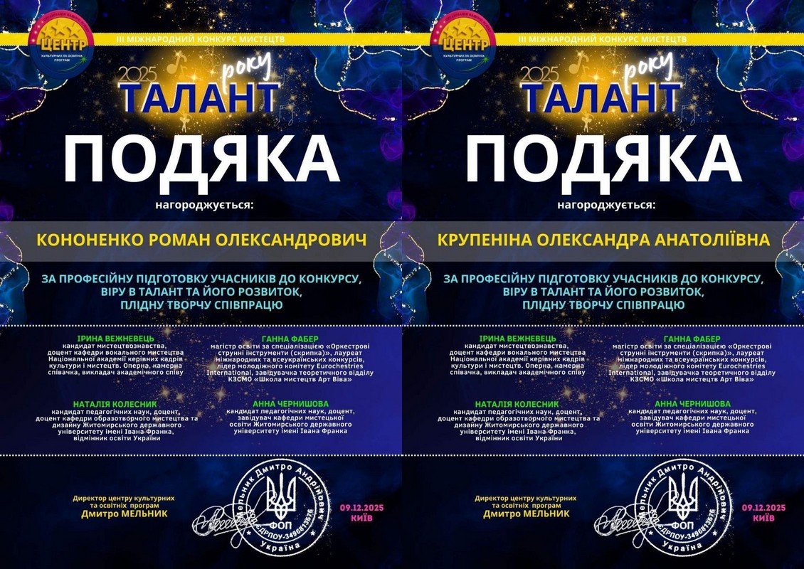 Роман Кононенко та Олександра Крупеніна отримали подяки за професійну підготовку учасниці до конкурсу, віру в талант та його розвиток, плідну творчу співпрацю.
