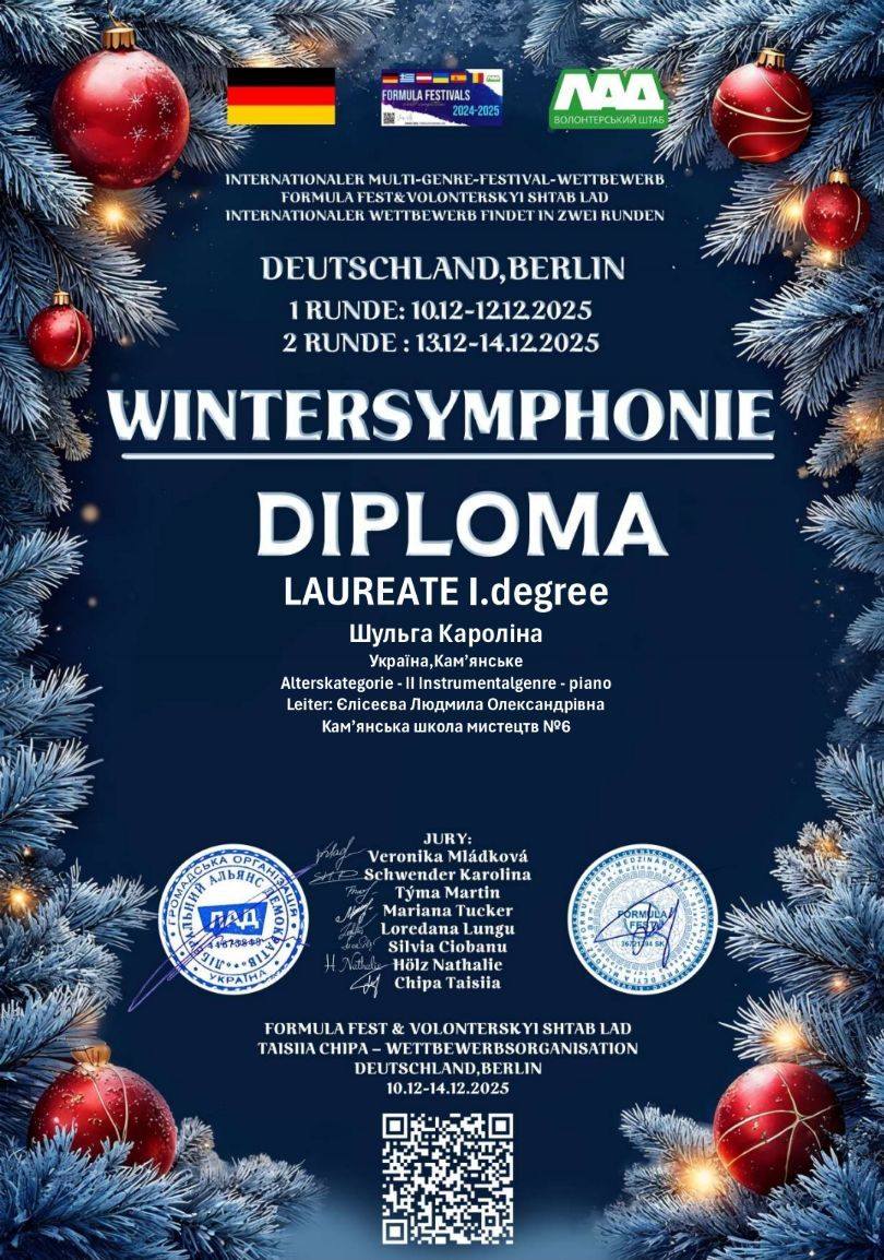 Скарбничка досягнень закладу поповнилася ще однією важливою нагородою. Нещодавно у Берліні відбувся престижний Міжнародний багатожанровий двотуровий фестиваль-конкурс WINTERSYMPHONIE. “Зимова симфонія” об’єднала талановитих виконавців із різних країн світу.