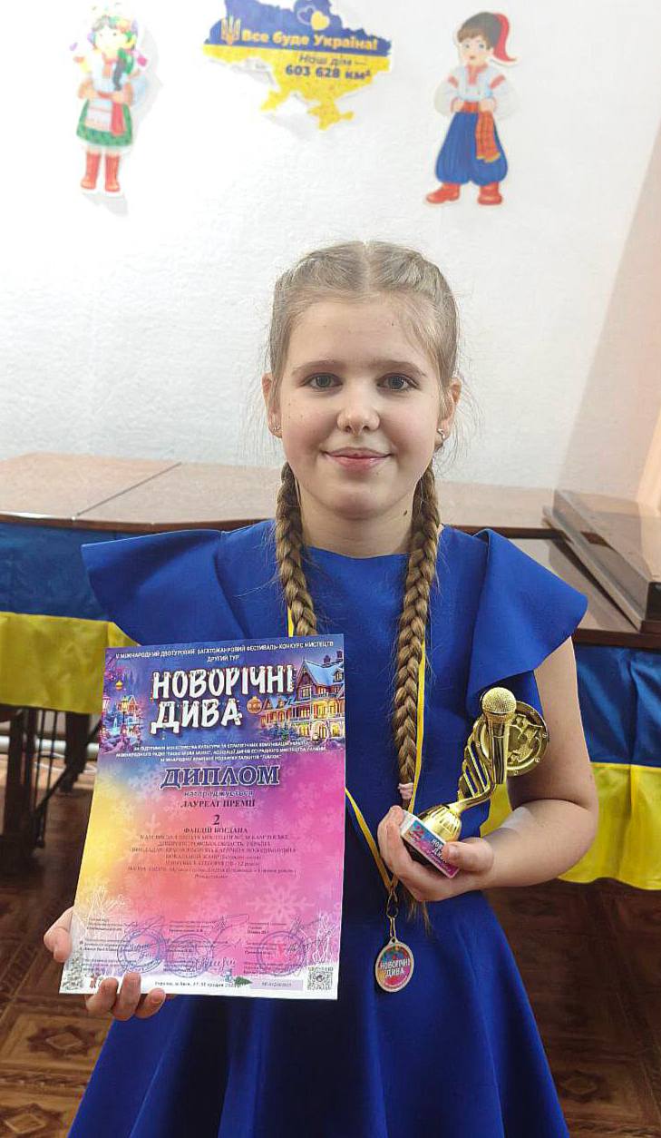 Школу мистецтв № 2 гідно представила учениця класу сольного співу Богдана Фандій. Виконавши пісню новорічної тематики, юна вокалістка отримала звання лауреата ІІ премії. Окрім диплома, її особиста колекція нагород поповнилася оригінальним пам’ятним кубком. Окрему вдячність організатори висловили її викладачу Катерині Краснопьоровій.