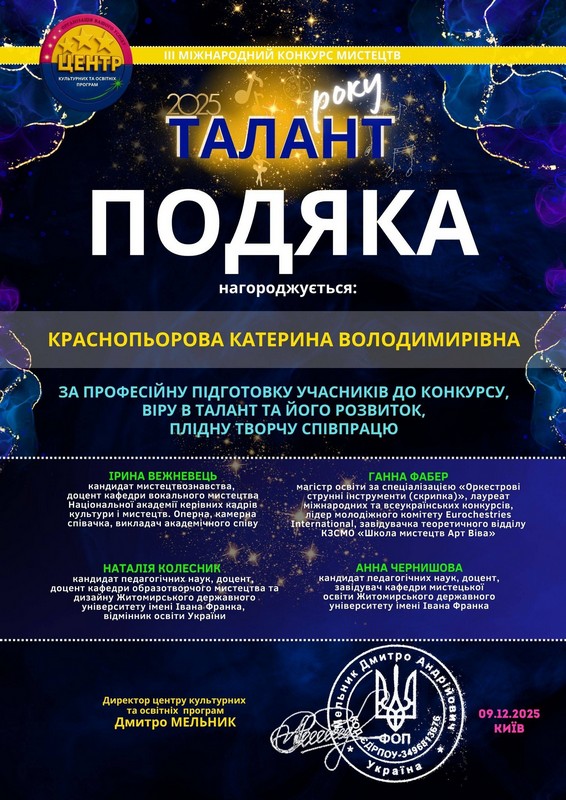 Здобувши диплом лауреата І премії, Мар’яна вкотре довела: її талант – це її сила. Організатори конкурсу підкреслили, що саме такі яскраві особистості змінюють світ на краще. Успіх учениці розділила і її викладач Катерина Краснопьорова, яка отримала подяку від організаторів за професійну підготовку учасниці до конкурсу, віру в талант та його розвиток, плідну творчу співпрацю.