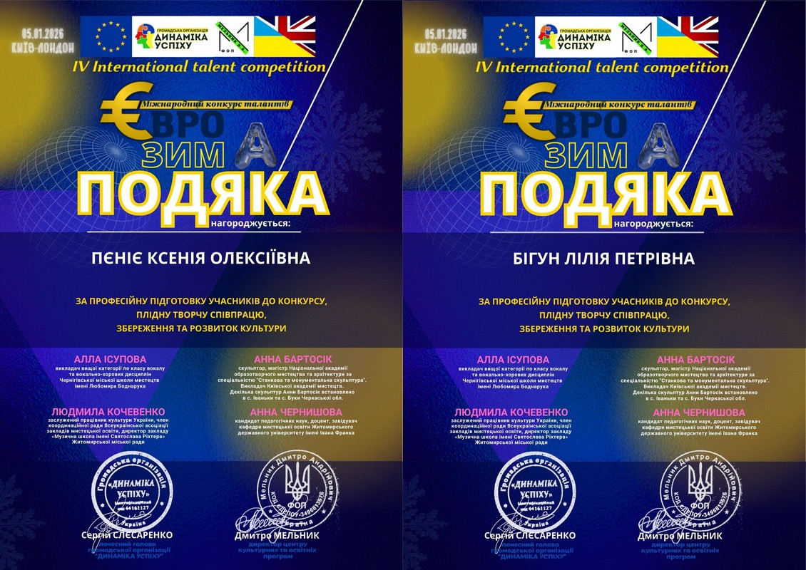Новий рік розпочався під акомпанемент успіху для хору молодших класів «Намистинки». 5 січня відбувся IV Міжнародний конкурс «Євро зима» (Київ – Лондон). Під чуйним керівництвом Ксенії Олексіївни Пєніє та у супроводі концертмейстера Лілії Петрівни Бігун юні артисти представили пісню «За селом веселим» (обробка К. Пєніє).