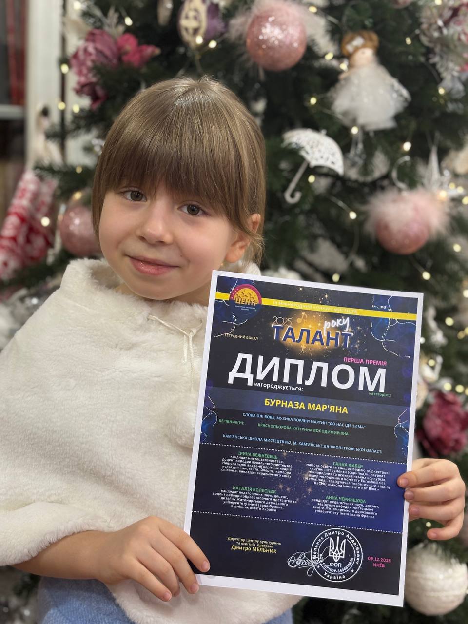 Ще раз підтвердила істину про те, що обдарована людина є талановитою в усьому, маленька зірочка Мар’яна Бурназа. На ІІІ Міжнародному конкурсі мистецтв «Талант року» вона перемогла у номінації «Естрадний вокал».
