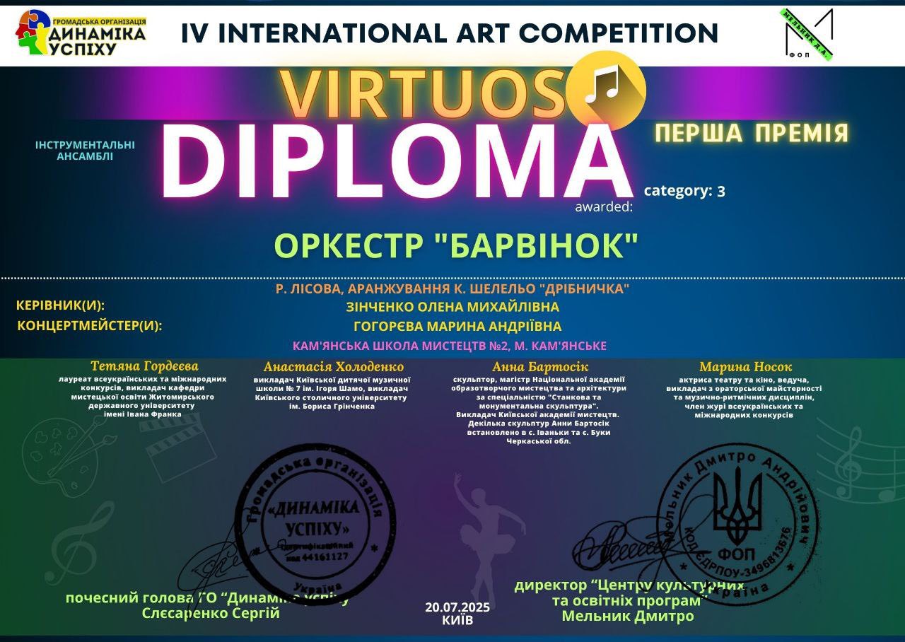 Оркестр “Барвінок“, виступаючи в номінації “Інструментальні ансамблі“, завоював диплом першої премії. Це досягнення стало можливим завдяки професійному керівництву Олени Зінченко та майстерній підтримці концертмейстера Марини Гогорєвої. Їхня злагоджена робота та віртуозне виконання були високо оцінені журі.