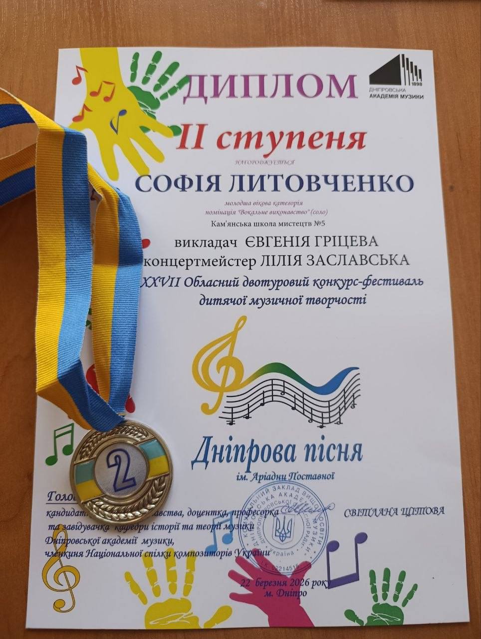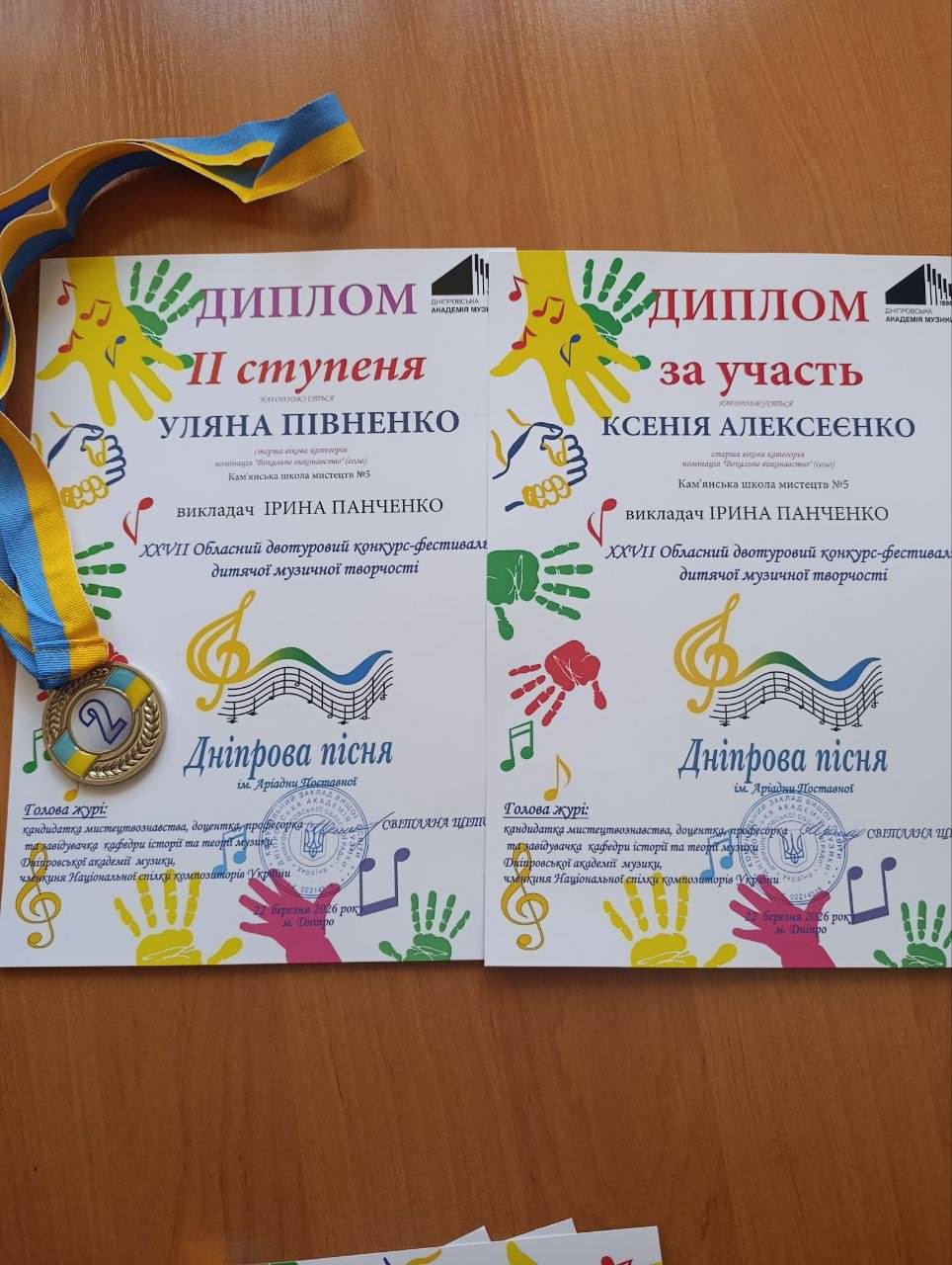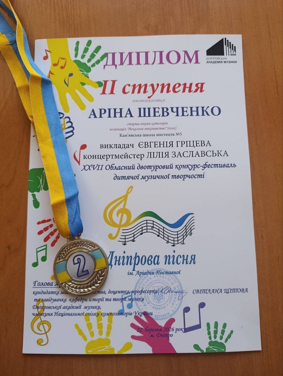 Учні Кам’янської школи мистецтв № 5 гідно виступили на ХХVII Обласному двотуровому конкурсі-фестивалі дитячої музичної творчості «Дніпрова пісня» імені Аріадни Поставної. Гала-концерт і нагородження учасників відбулися 29 березня у Дніпровській академії музики.