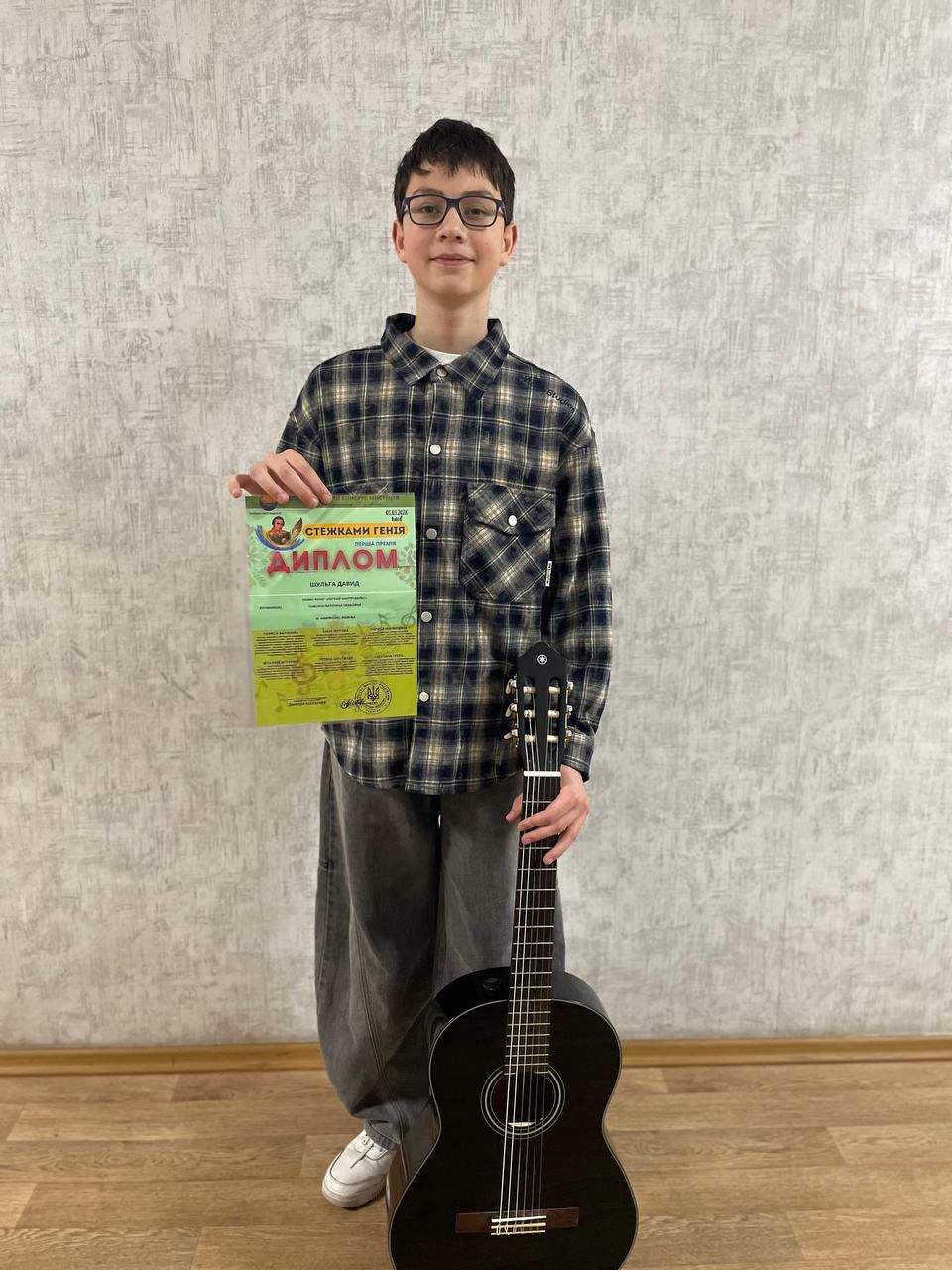 Ще одну вагому перемогу приніс школі Давид Шульга. За підсумками III Всеукраїнського конкурс мистецтв «Стежками Генія» (до дня народження Т. Шевченка), що відбувся 5 березня (Київ), юний гітарист здобув диплом І премії. Давид зіграв “Легкий кантрі-вальс” Томмі Флінта.